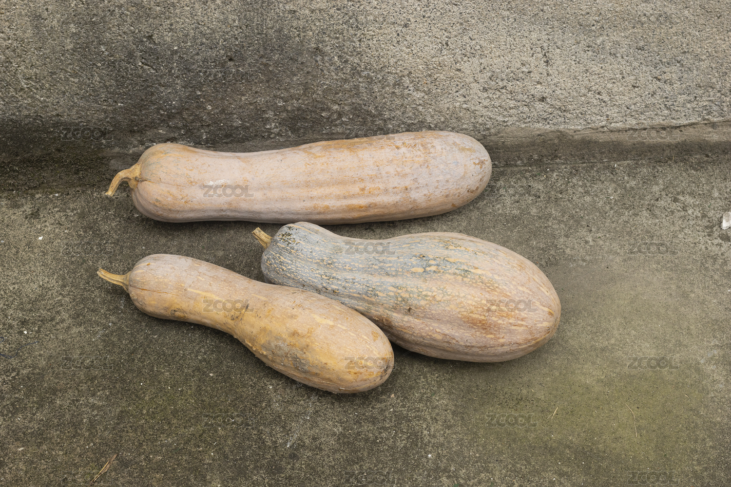 水泥地面上横向摆放的三个老南瓜