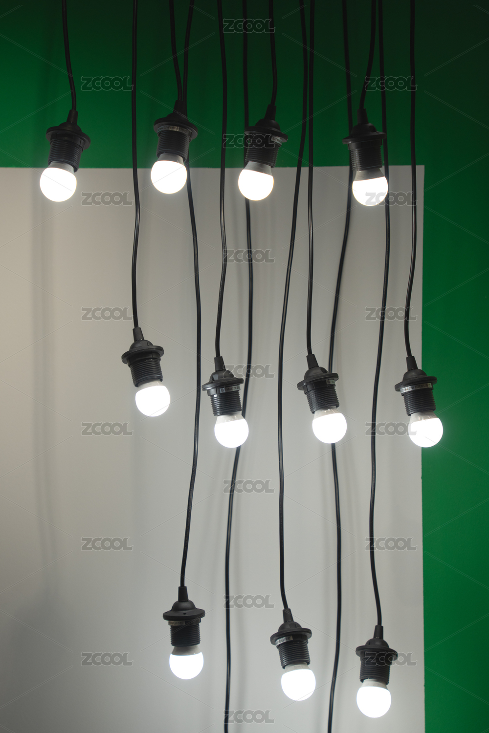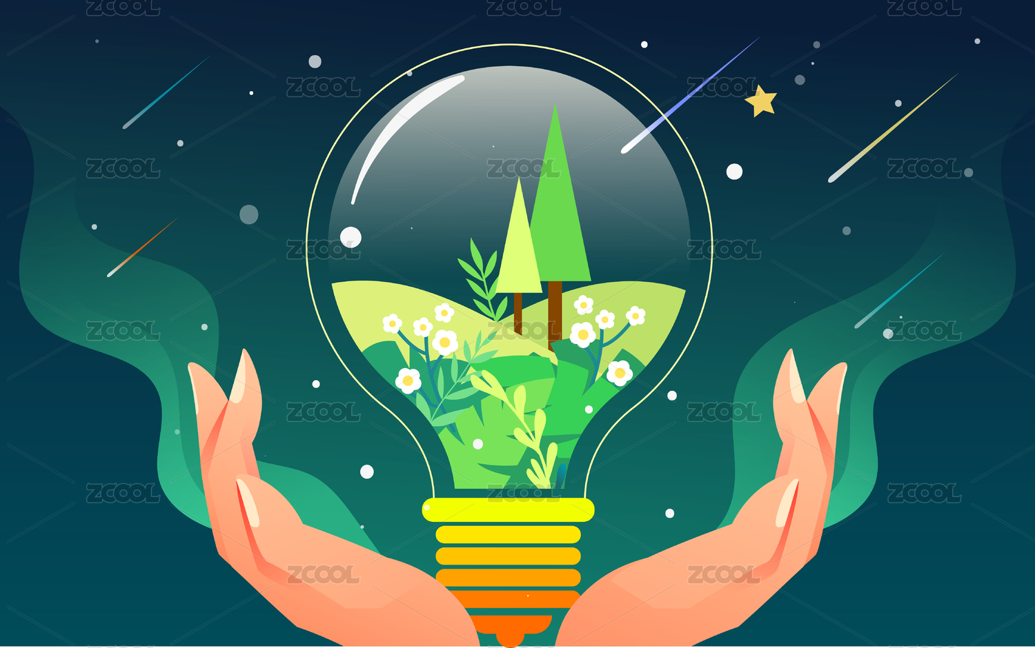 电灯四周摆放着绿色叶子的创意绿色智慧能源