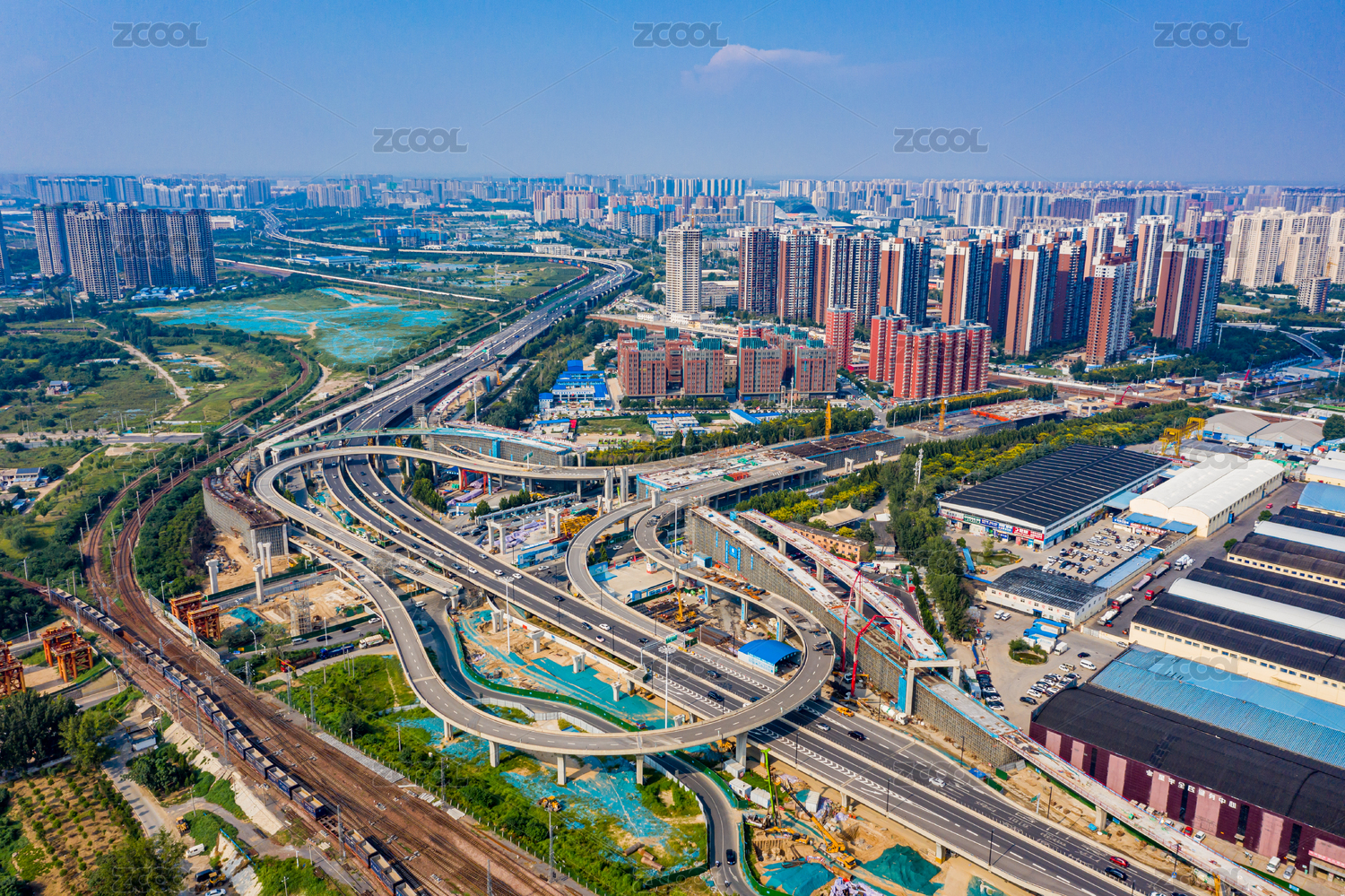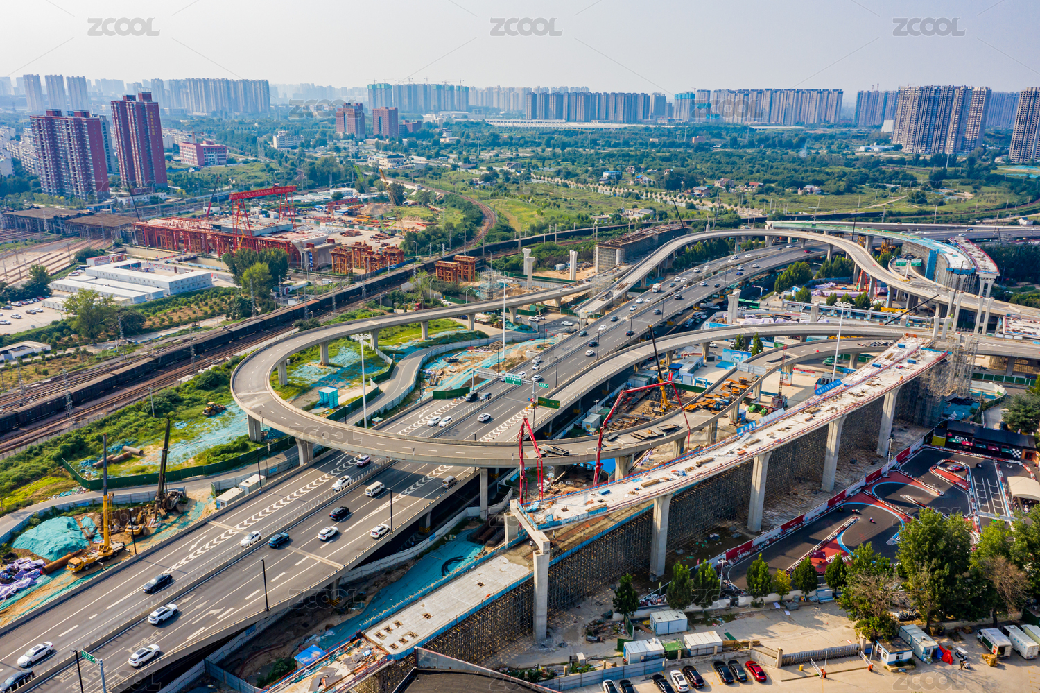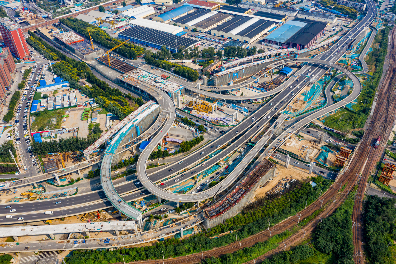 航拍郑州彩虹桥拆解新建工程匝道钢箱梁架设