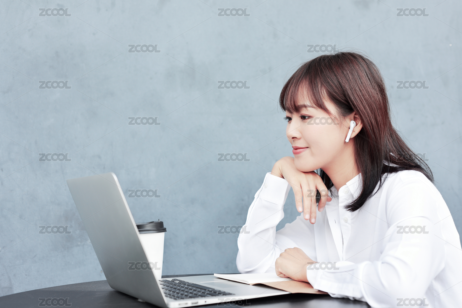一位戴无线蓝牙耳机的中国年轻女白领在户外使用手提电脑