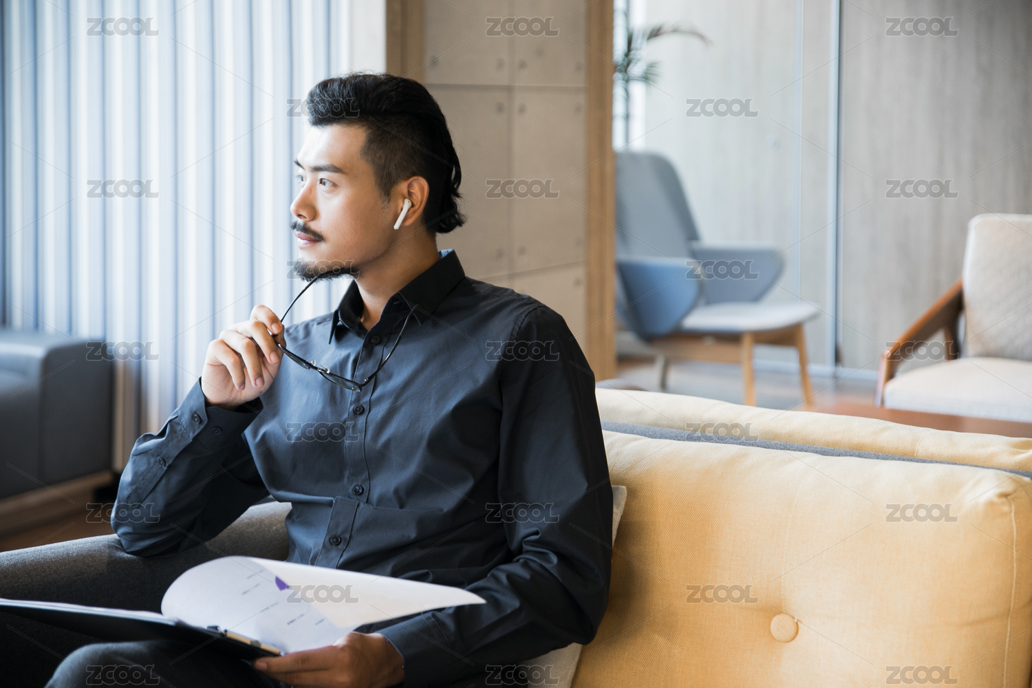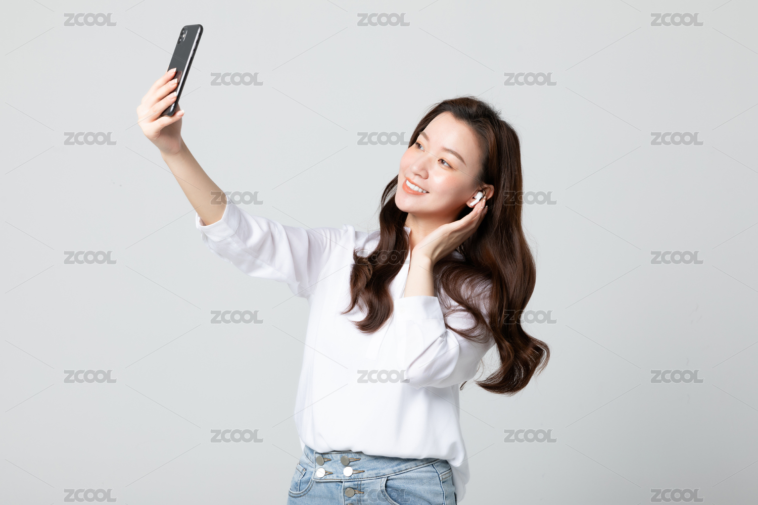一位戴着蓝牙无线耳机的中国年轻女白领双手拿着手机