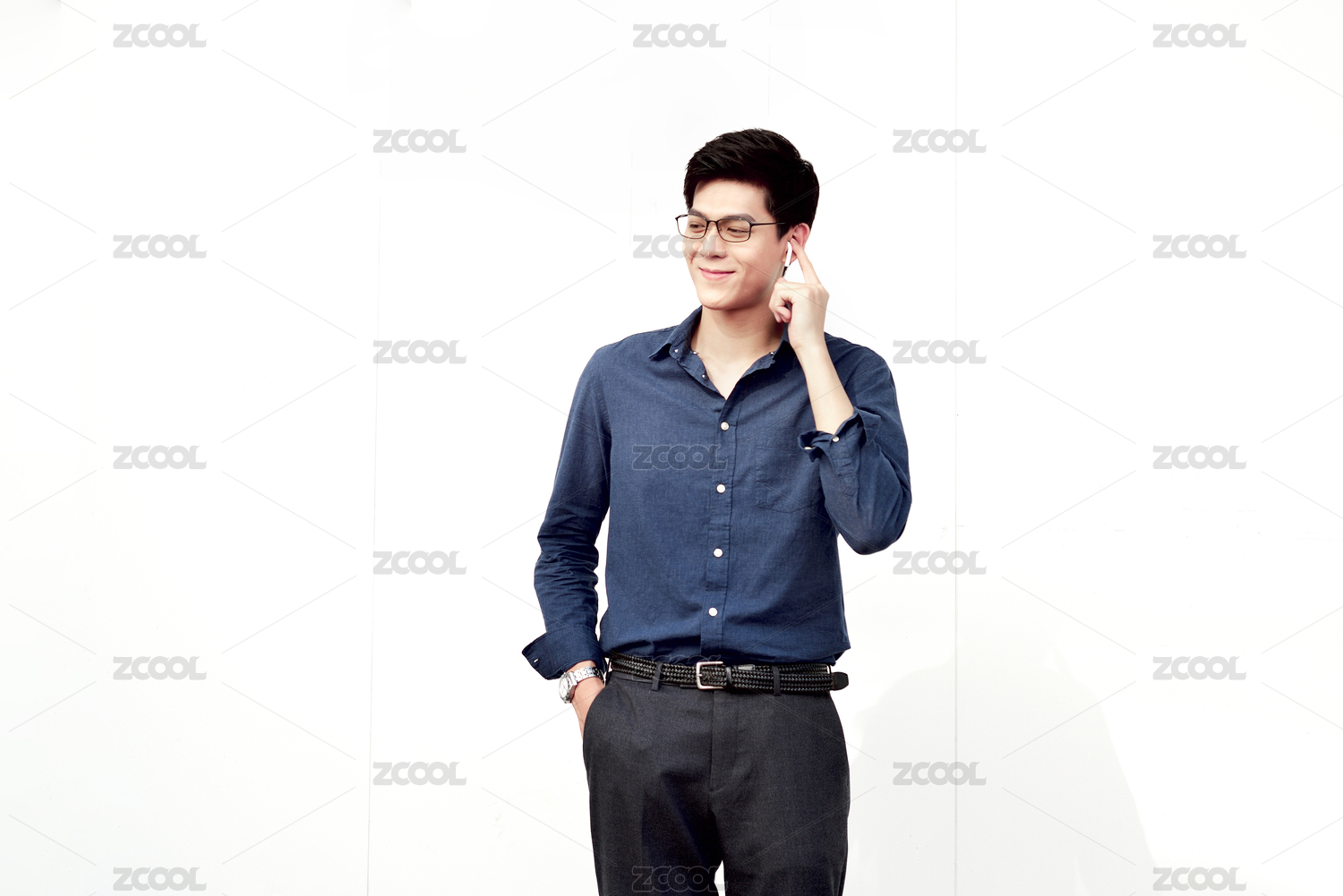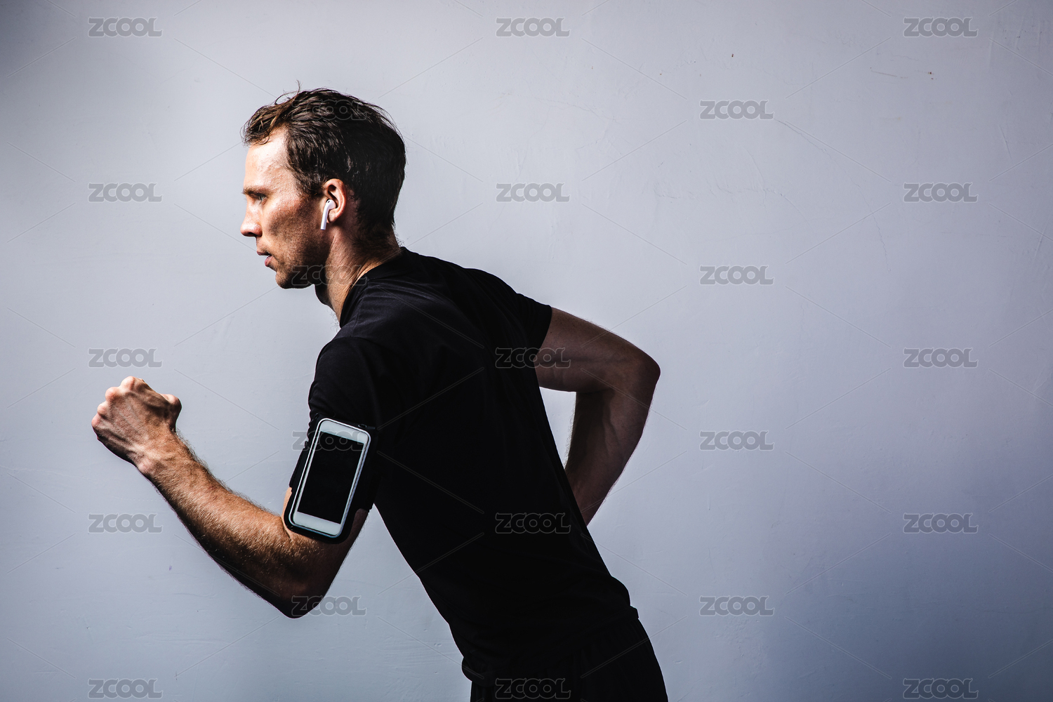 白色背景特写穿着运动服戴着运动蓝牙耳机的英俊男性在做跑步的姿势