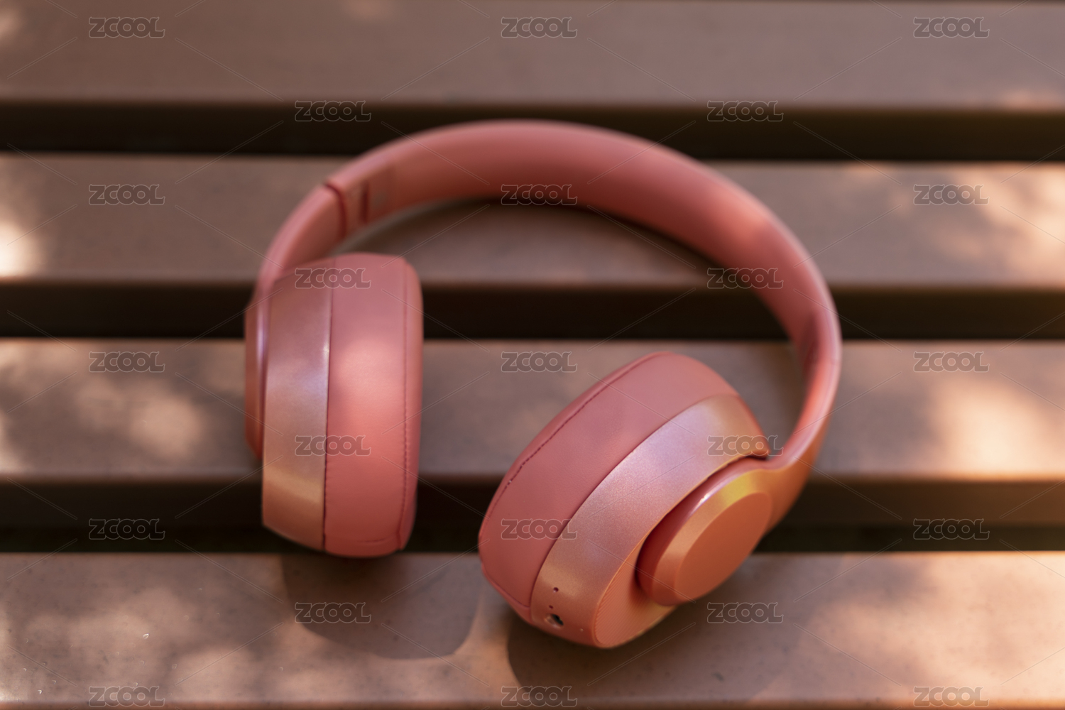 笔记本电脑,蓝牙耳机与平板电脑俯拍特写