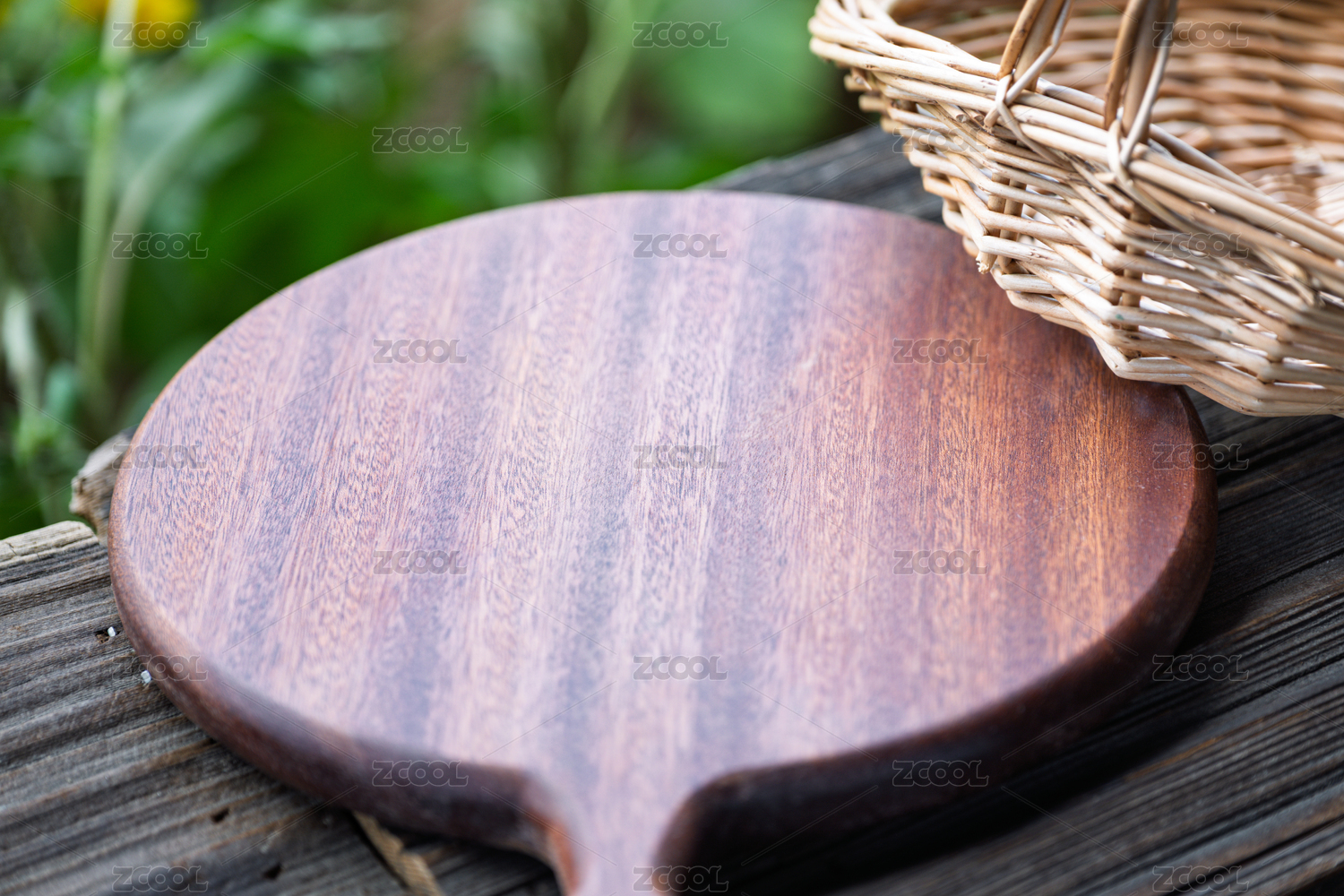 户外木制砧板与编织篮的静谧场景