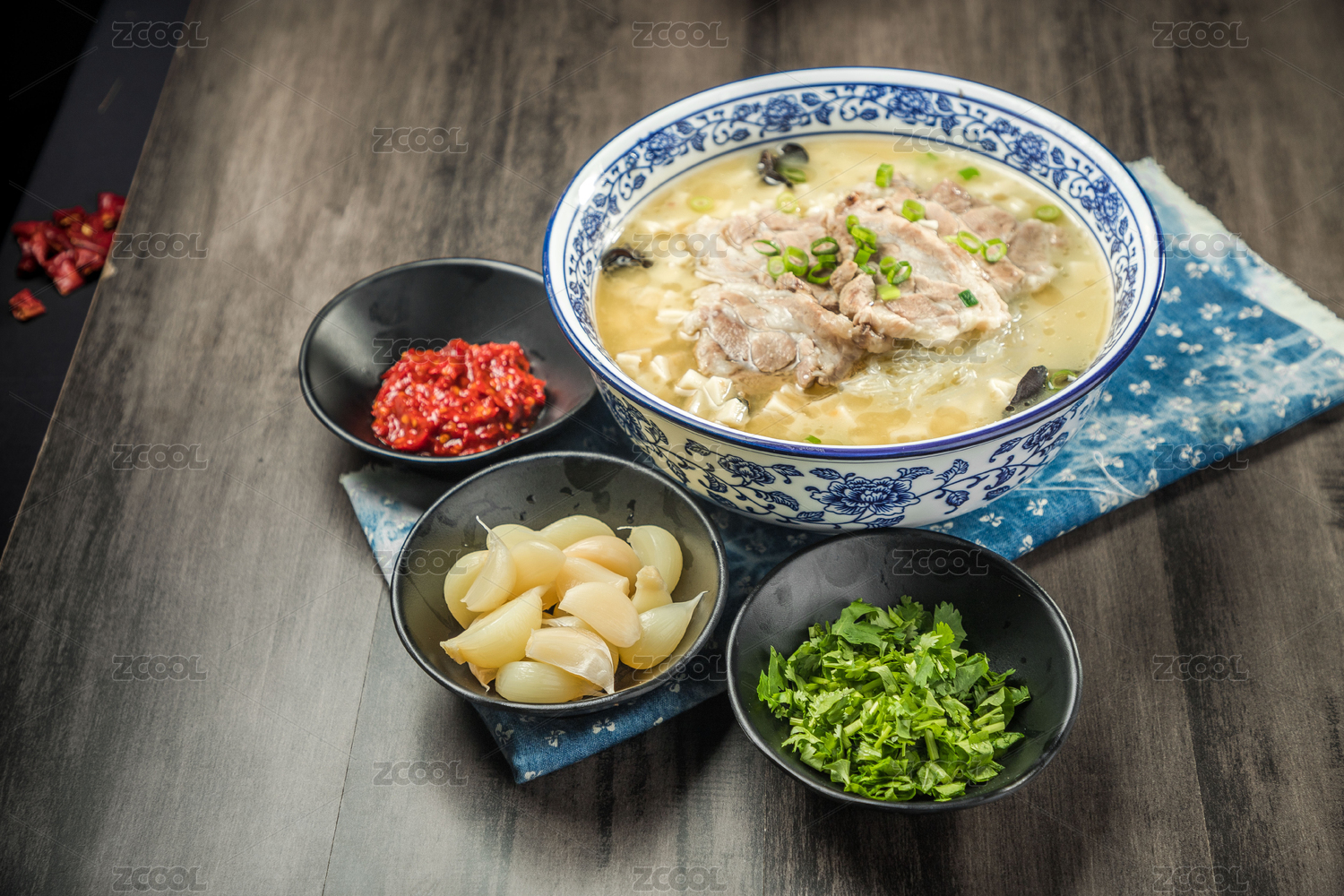 棕色木纹桌面上放着一份羊肉泡馍套餐
