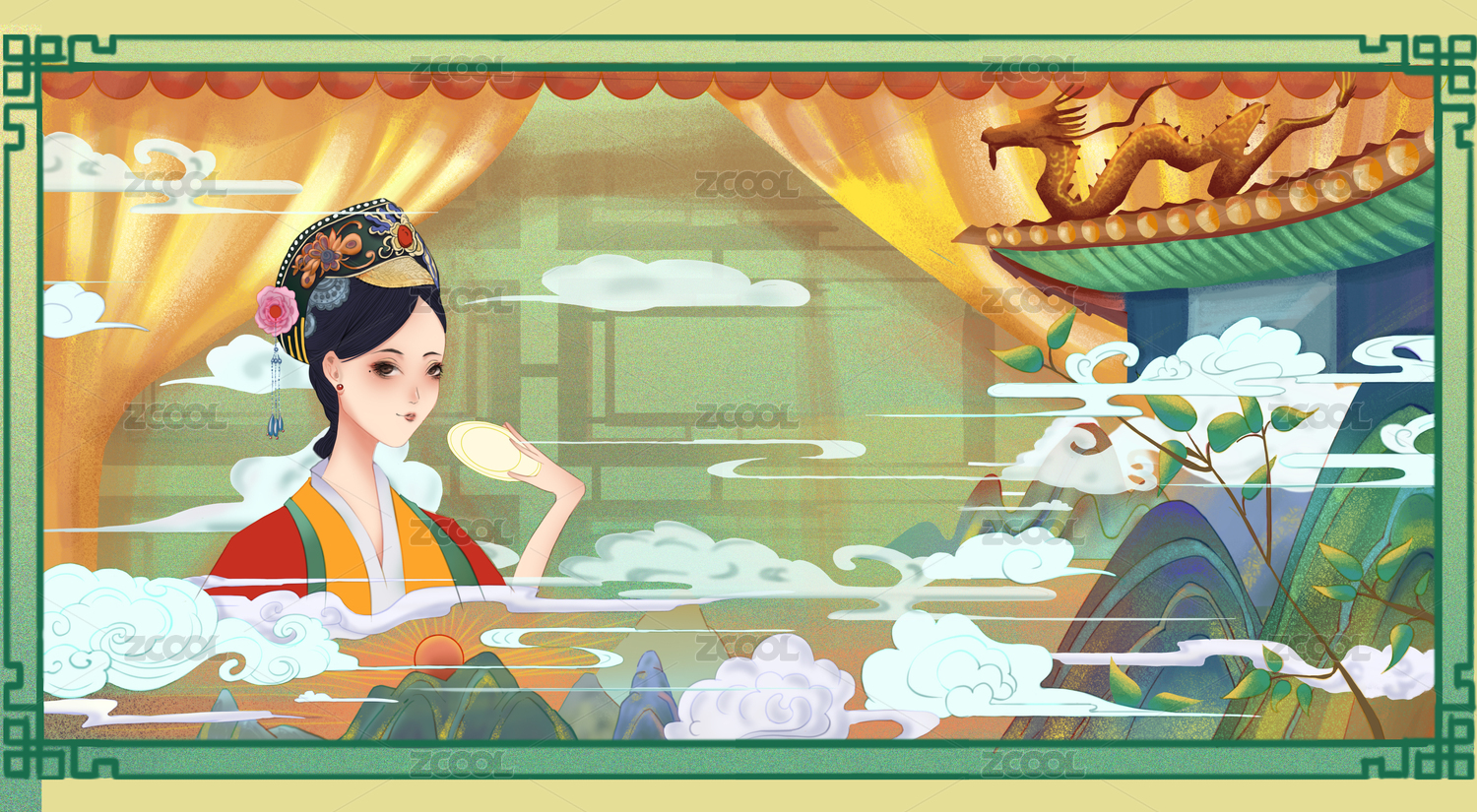 在背景是皇室宫廷山水楼阁云下吃东西的宫廷