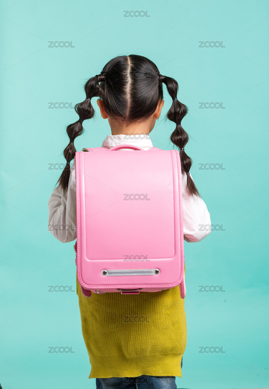 扎辫子小女孩背书包的背影