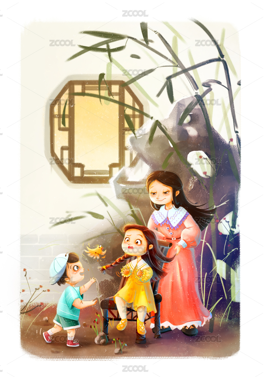 在庭院里妈妈帮姐姐扎辫子调皮的弟弟在抓鸟