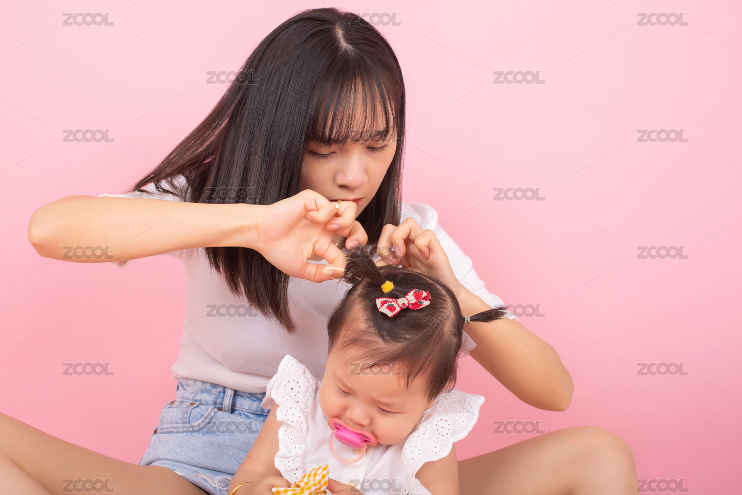妈妈正给可爱的宝宝扎辫子