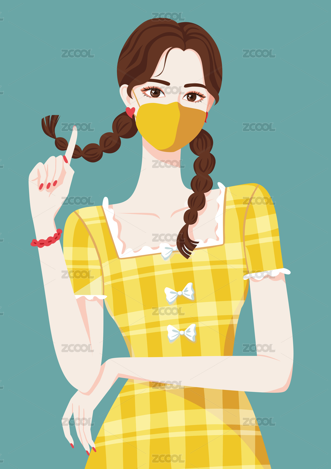 戴口罩扎辫子黄裙子的时尚可爱女孩
