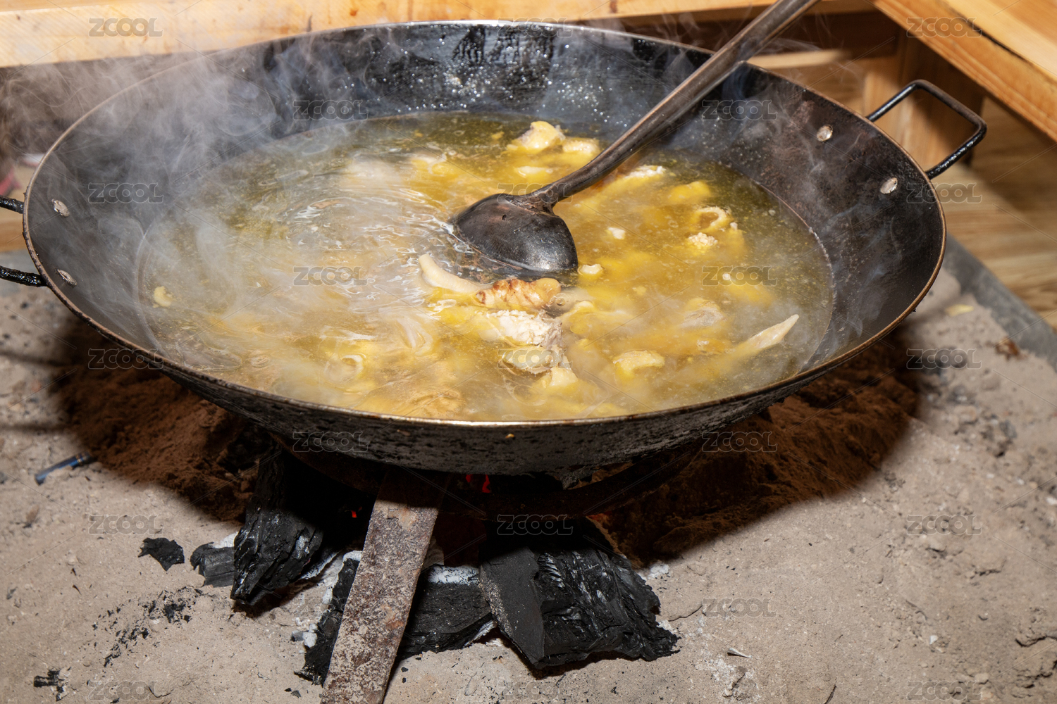 冬天炭火围炉铁锅炖煮鸡肉
