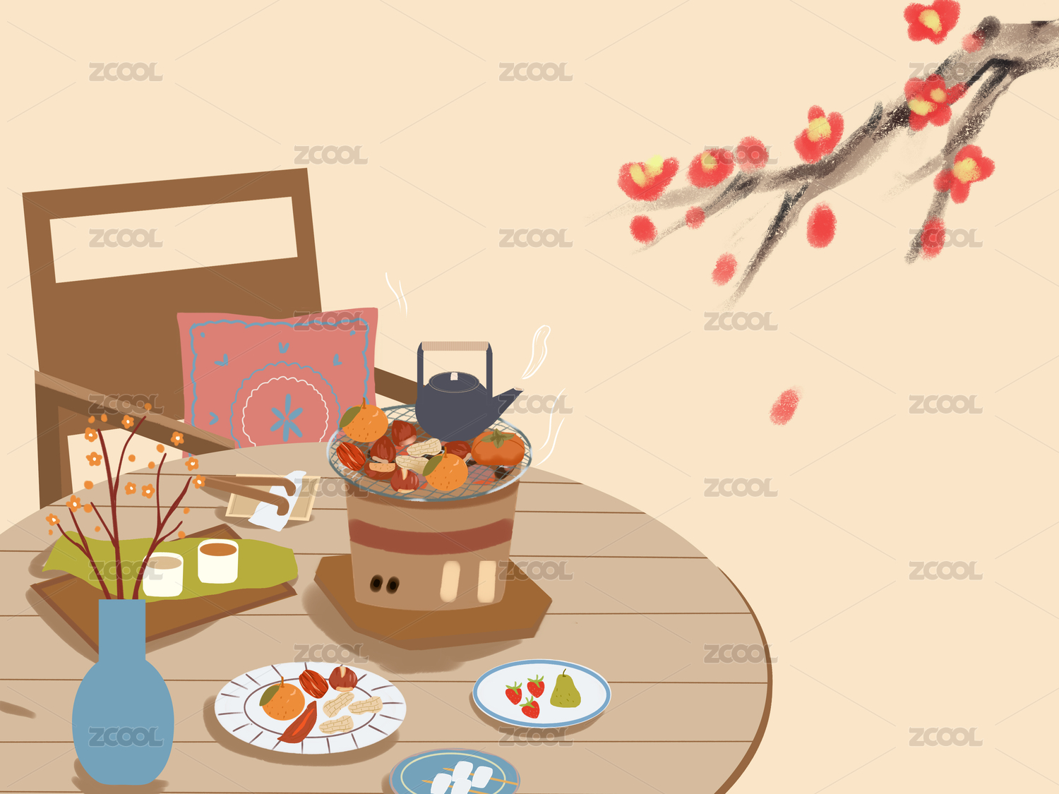 冬天窗前围炉煮茶梅花书桌清供小品静物国风