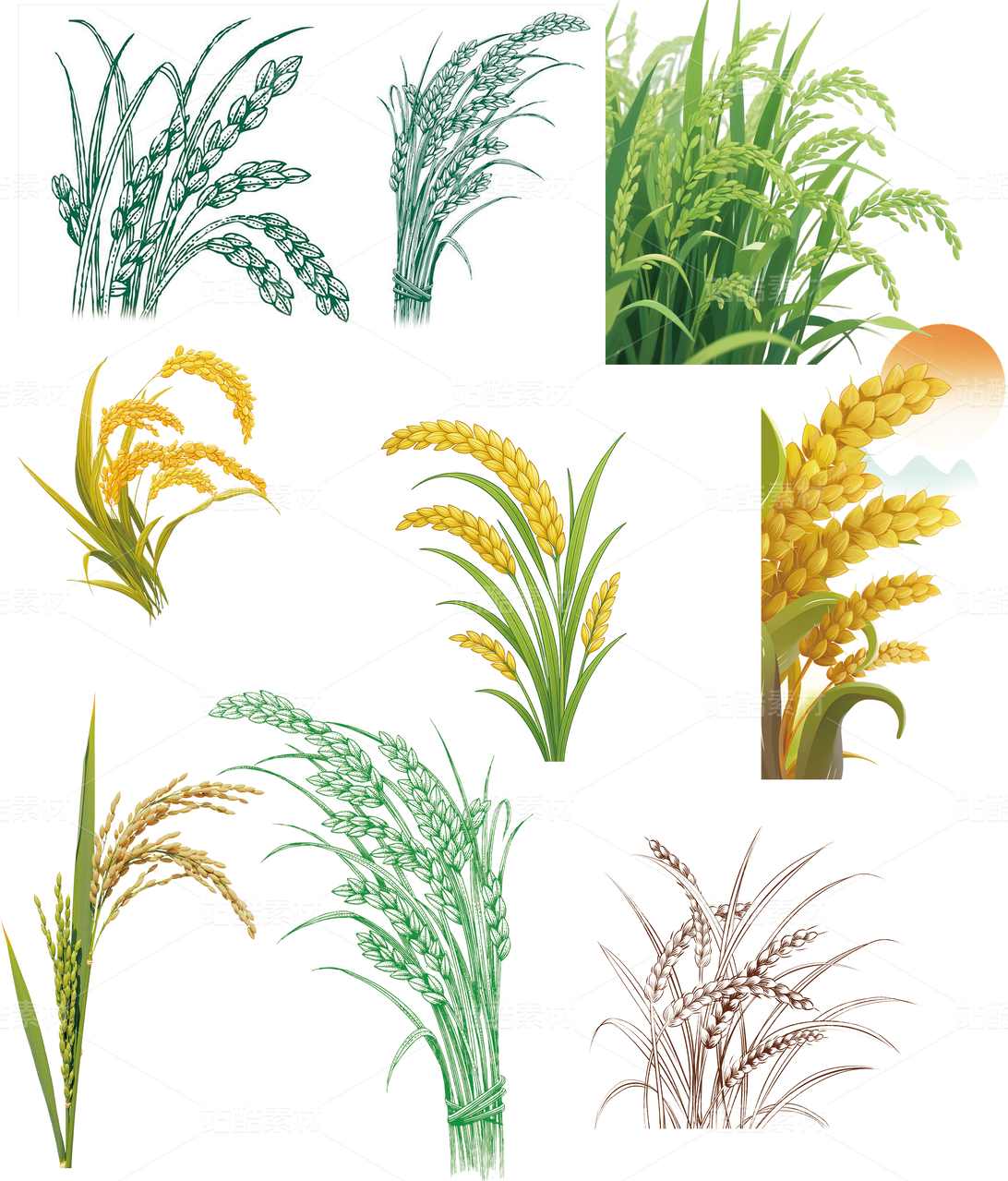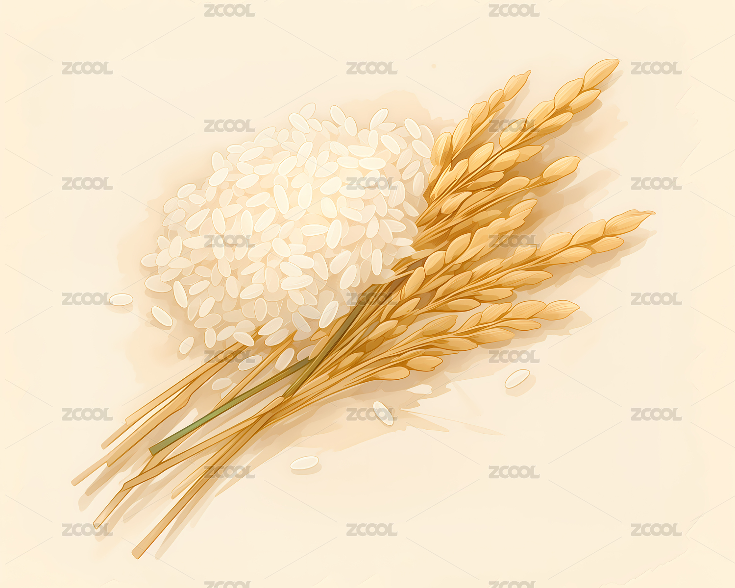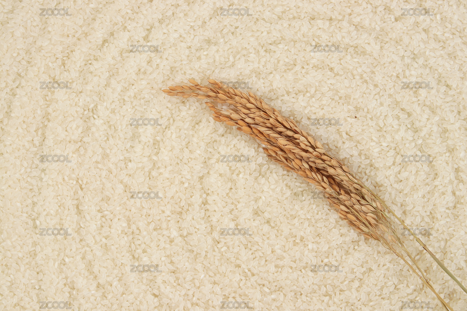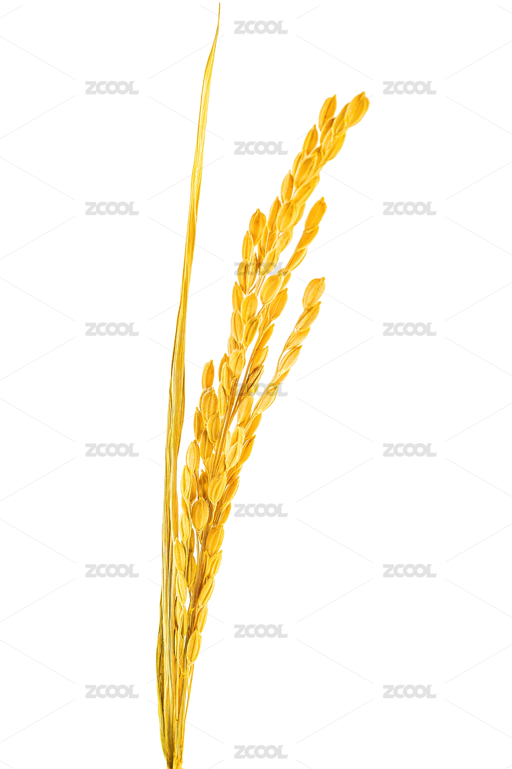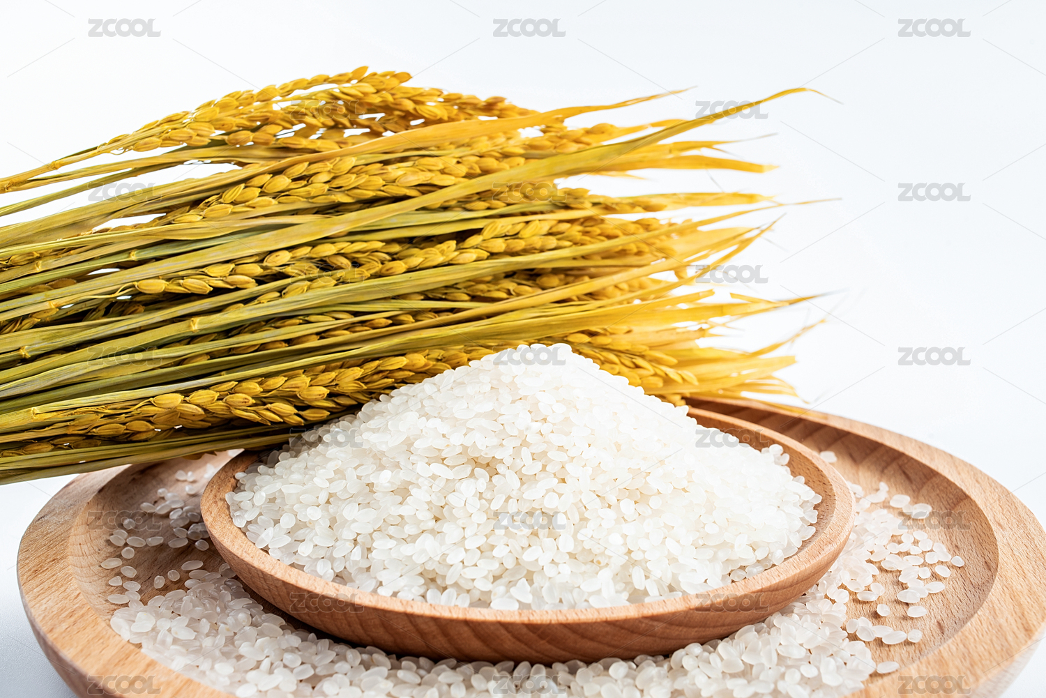 白背景上一把金黄色的稻穗和一碟圆粒大米