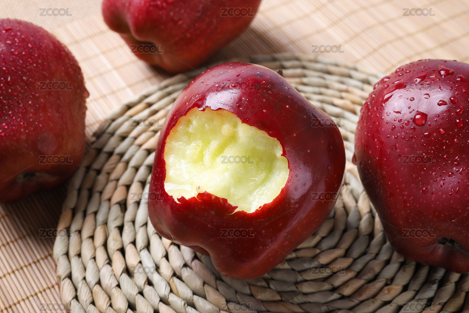 放在竹帘背景编制垫上咬了一口的花牛蛇果