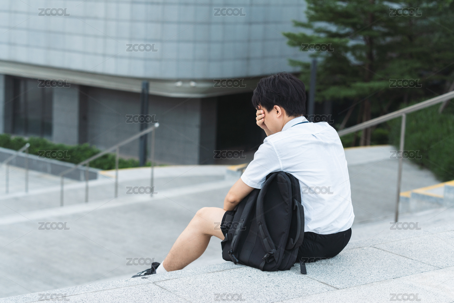 亚洲男生坐在台阶上捂脸背影