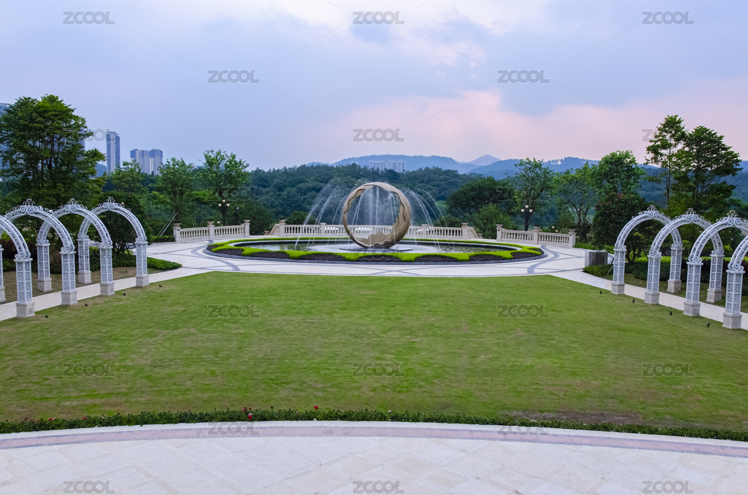 福建厦门杏林湾湖畔的环形艺术装置与古塔