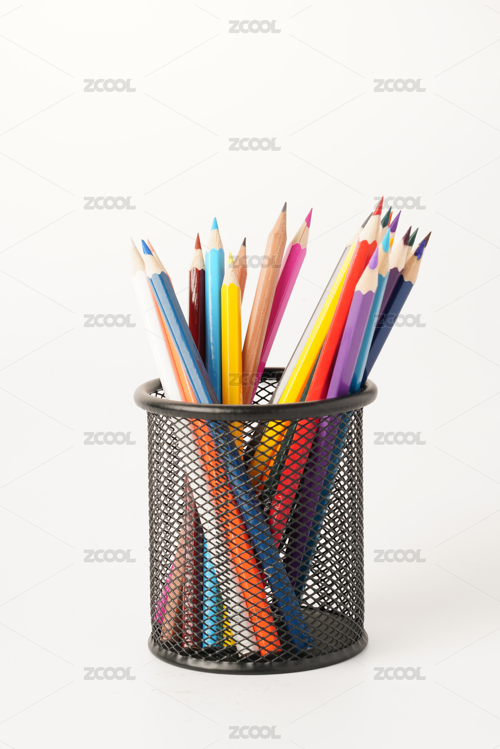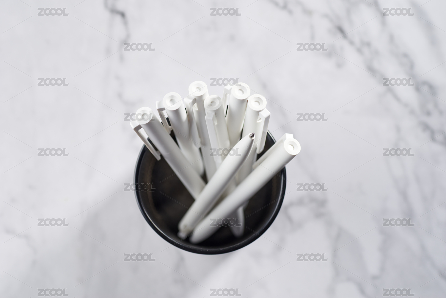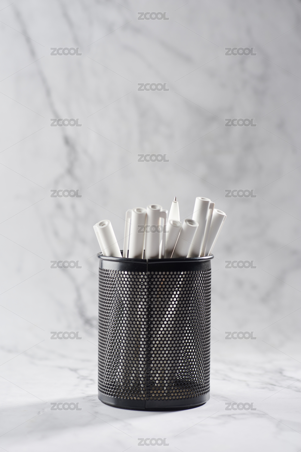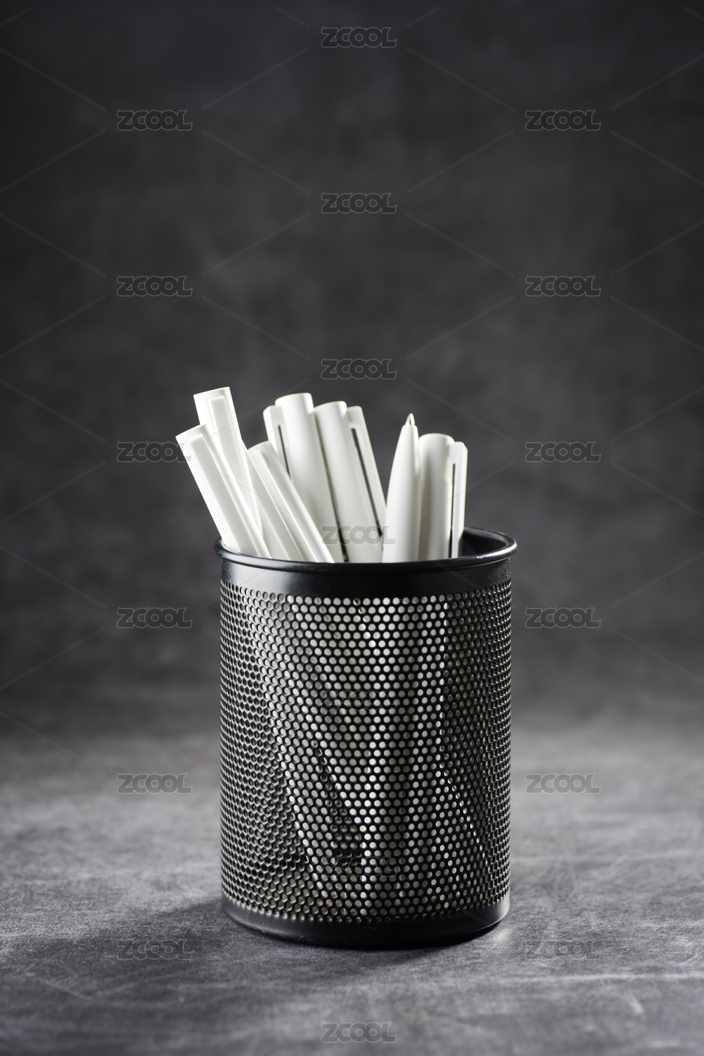 两个精致青花陶瓷笔筒在桌面上,在暗调背景中