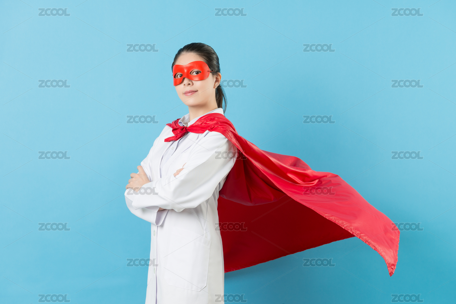 专业自信的女医生戴着蓝色的背景和手面具站在超级英雄服装交叉放在胸前上面对相机。