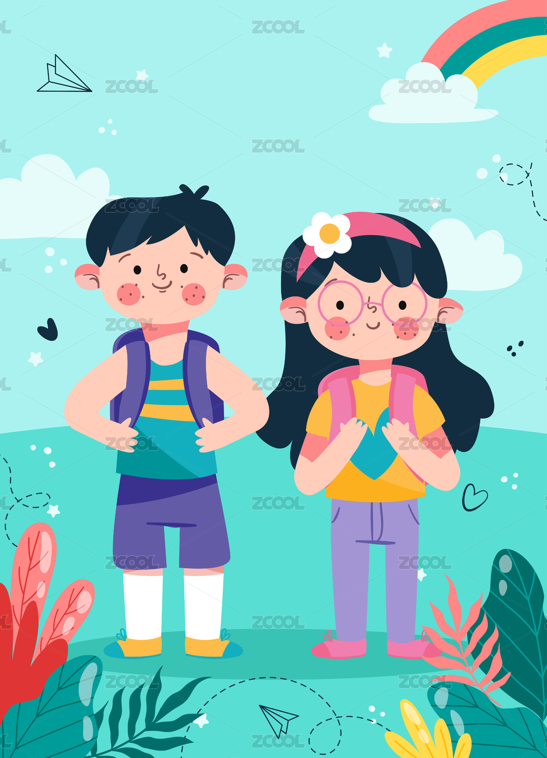 两个小朋友一起去学校上学扁平矢量插画