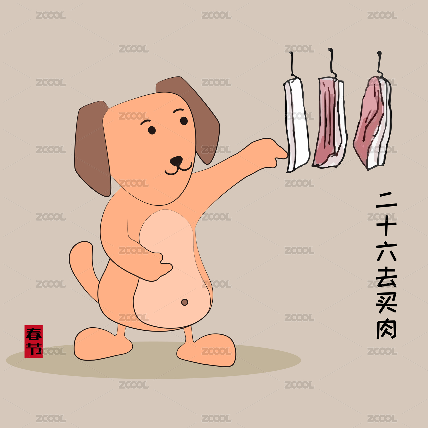 春节前习俗二十六去买肉 可爱狗年卡通矢量