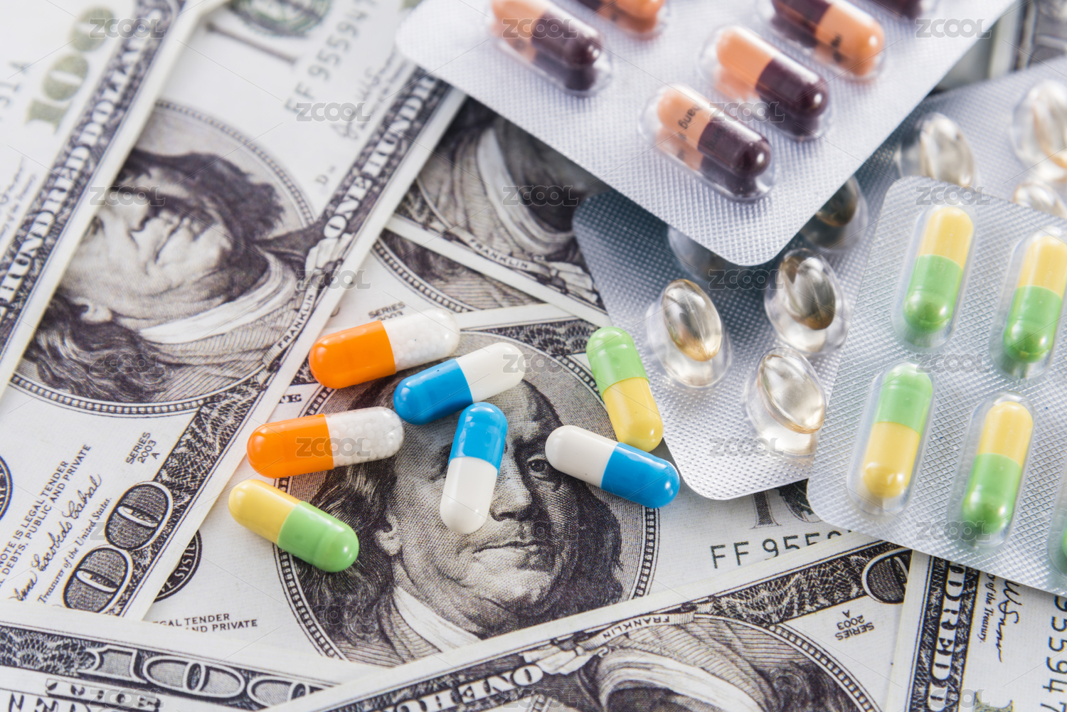 一个人坐着桌子旁看着满桌子的中药西药药丸药囊药片保健品很烦恼烦躁生病得病治病买药药价概念