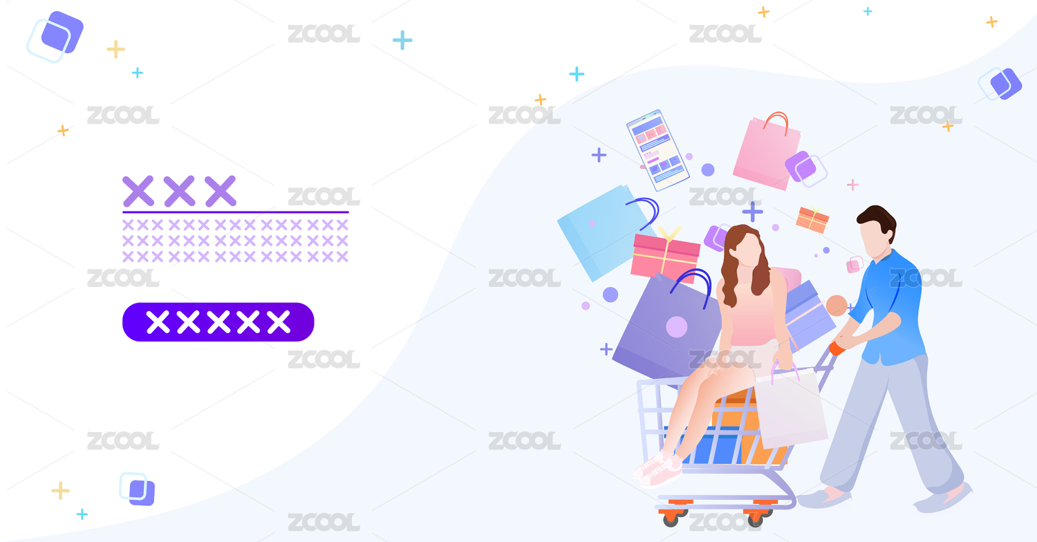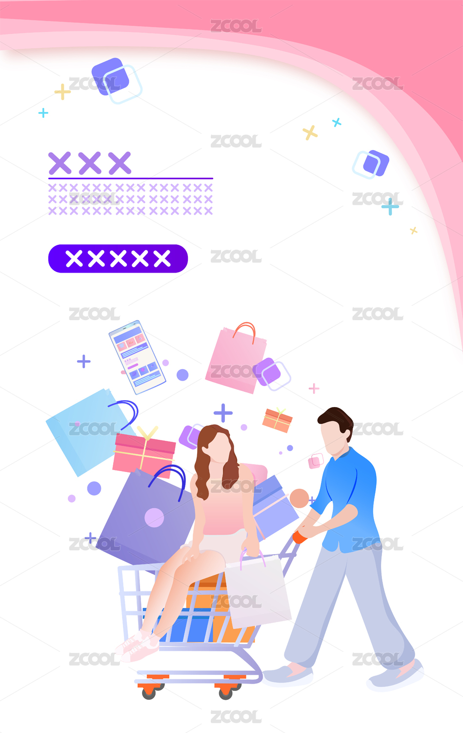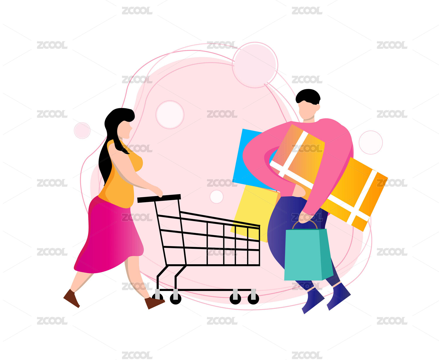 一对情侣推着购物车购买商品,女生手提包包坐在购物车上插画背景