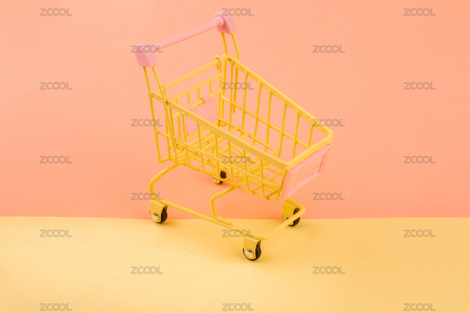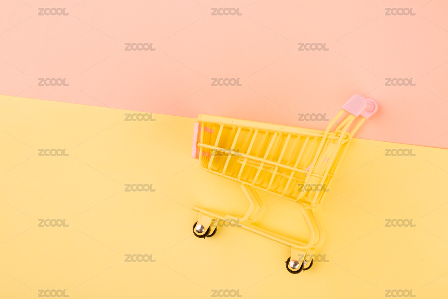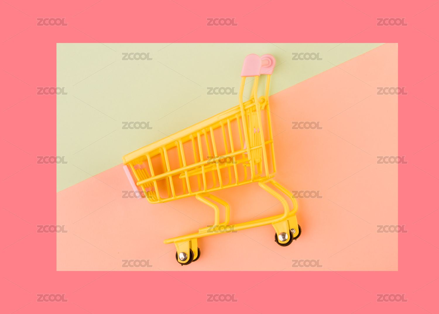 一对情侣推着购物车购买商品,女生手提包包坐在购物车上插画背景