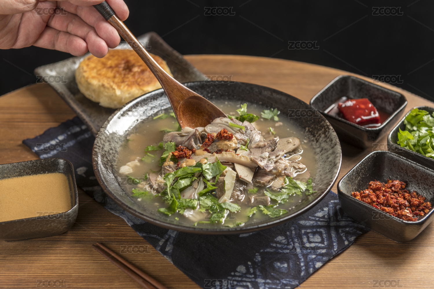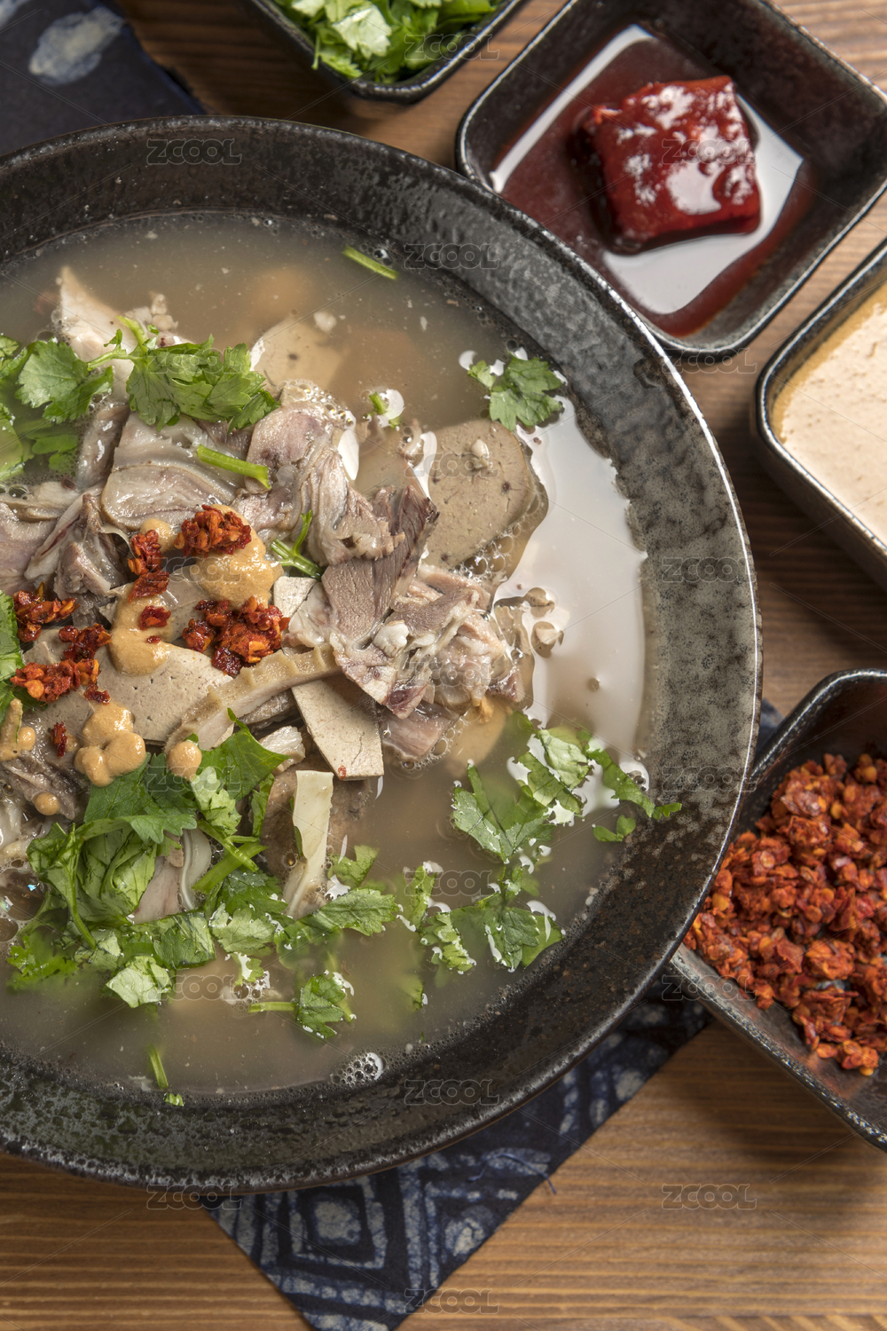 天津小吃全羊汤羊杂汤摆放在木桌面上特写