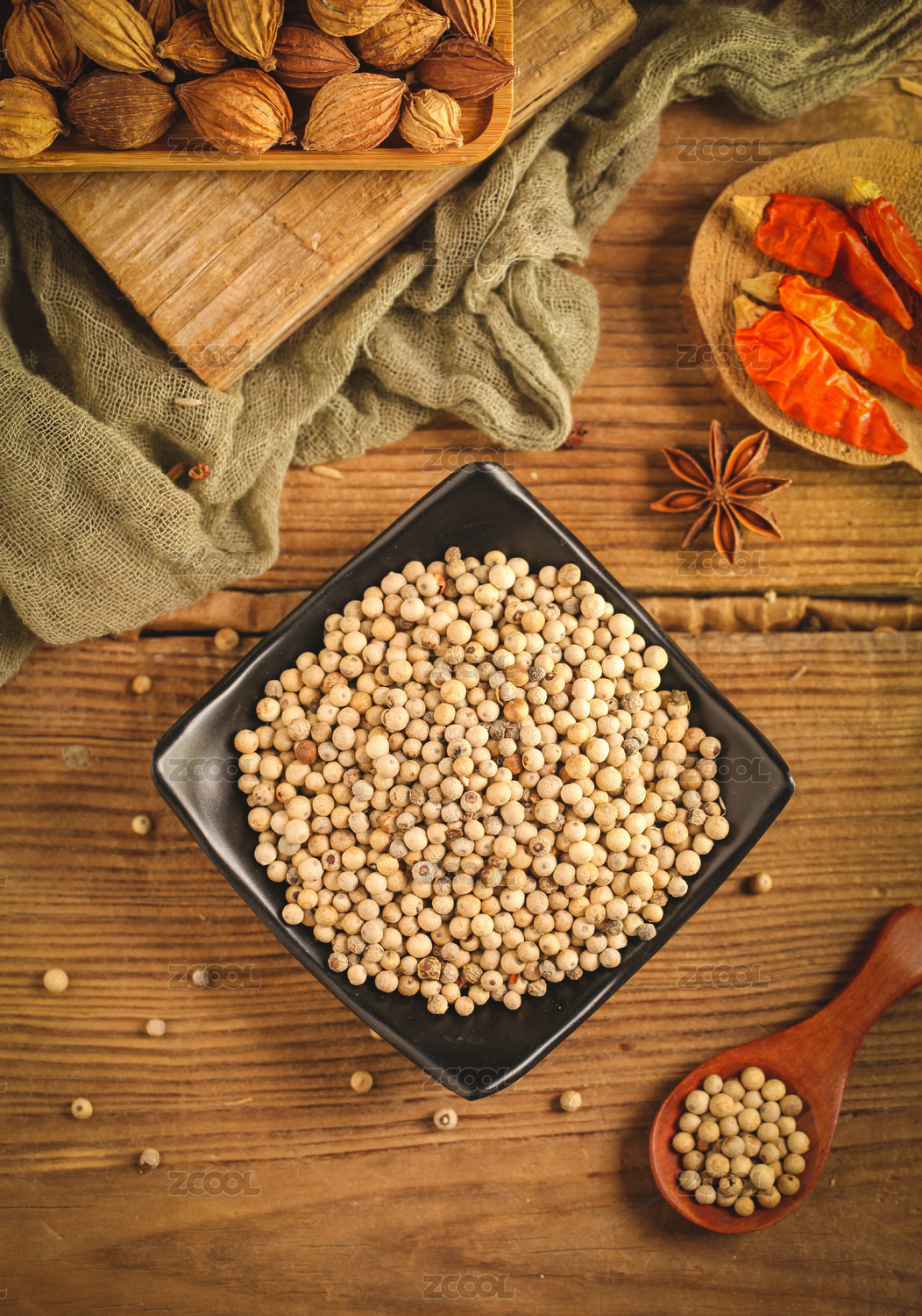 木底上放着一盘白胡椒粒