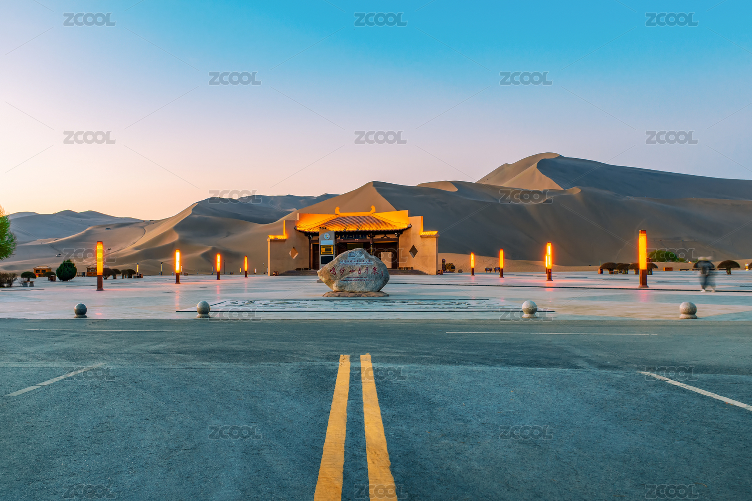 中国甘肃酒泉敦煌鸣沙山景区广场晨景
