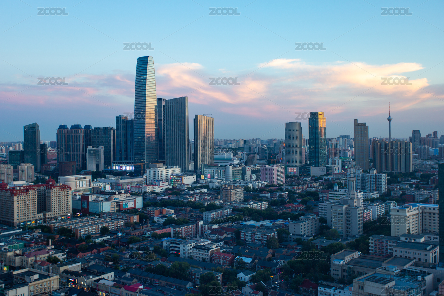 天津城市高楼傍晚航拍风光
