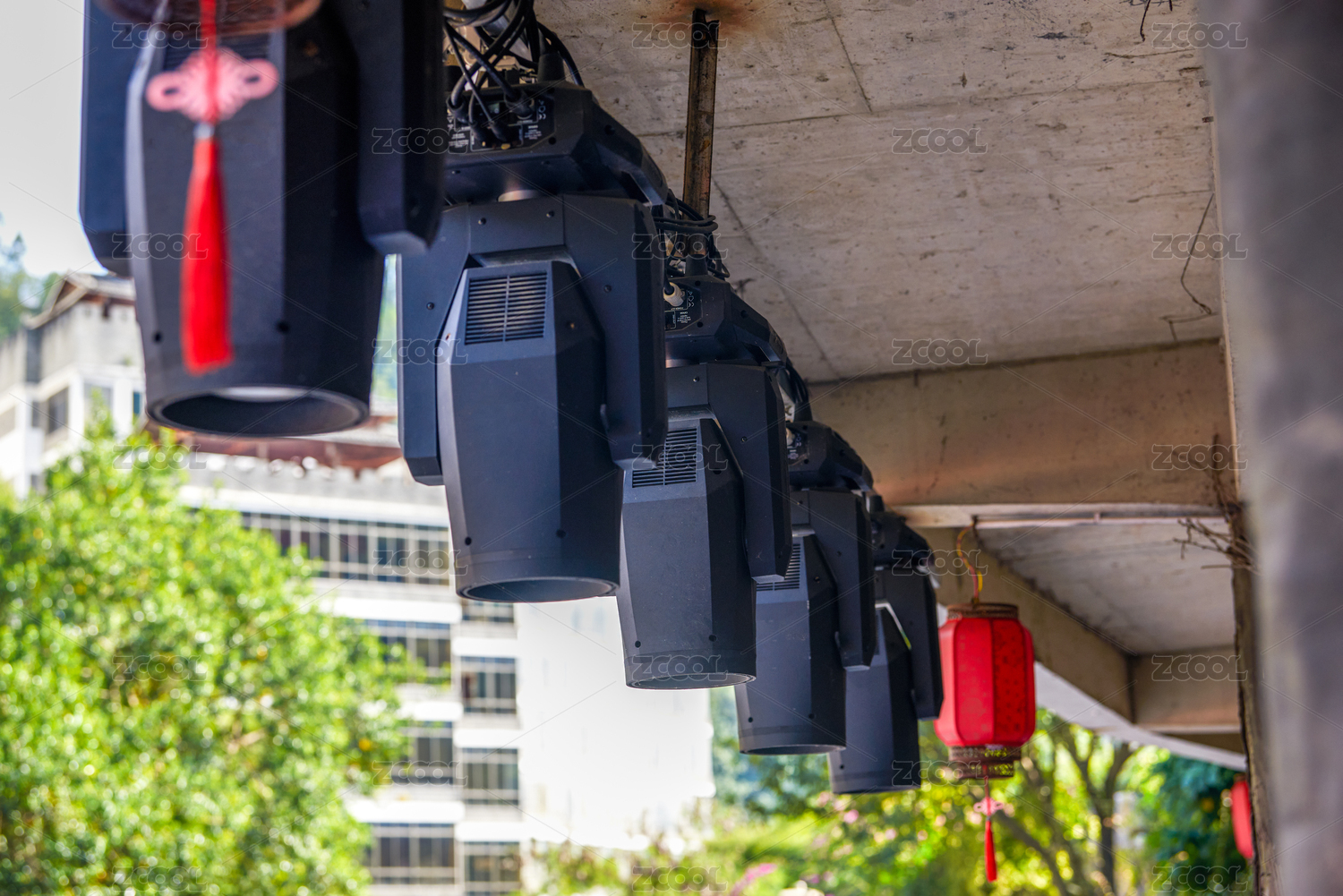 专业舞台上的探照射灯和专业音响设备
