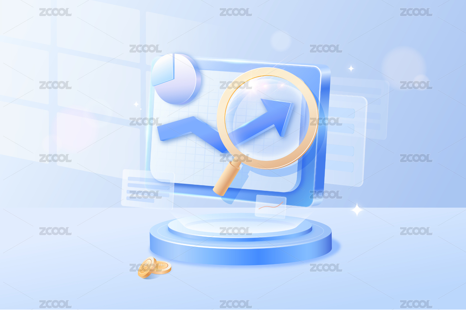 放大镜中的上升箭头和饼图图表
