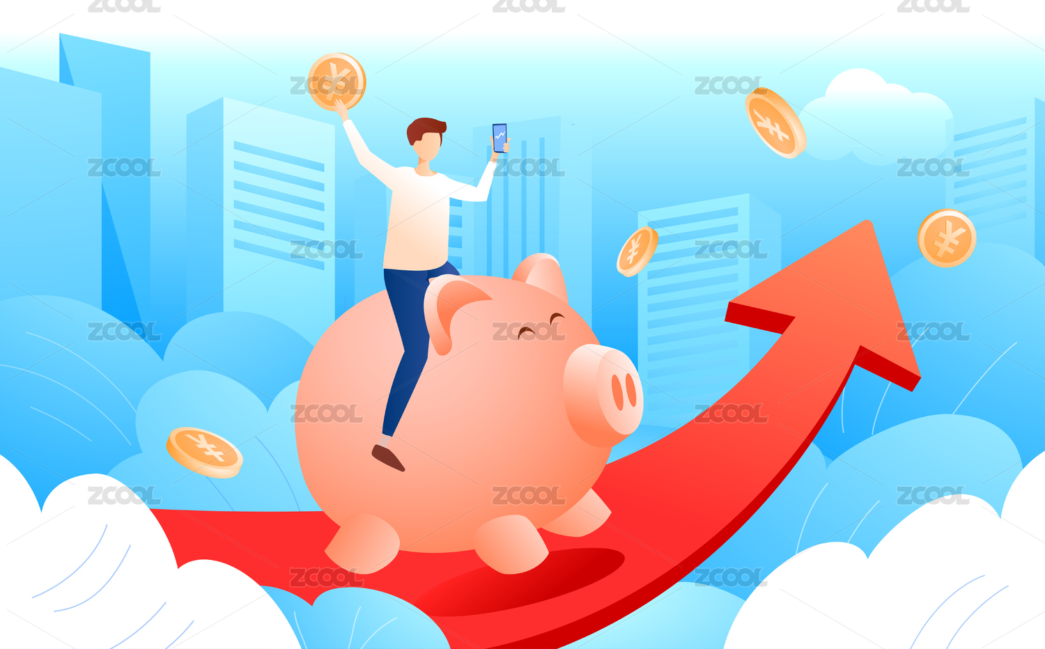 男孩骑在存钱罐飞奔在有箭头的城市背景上