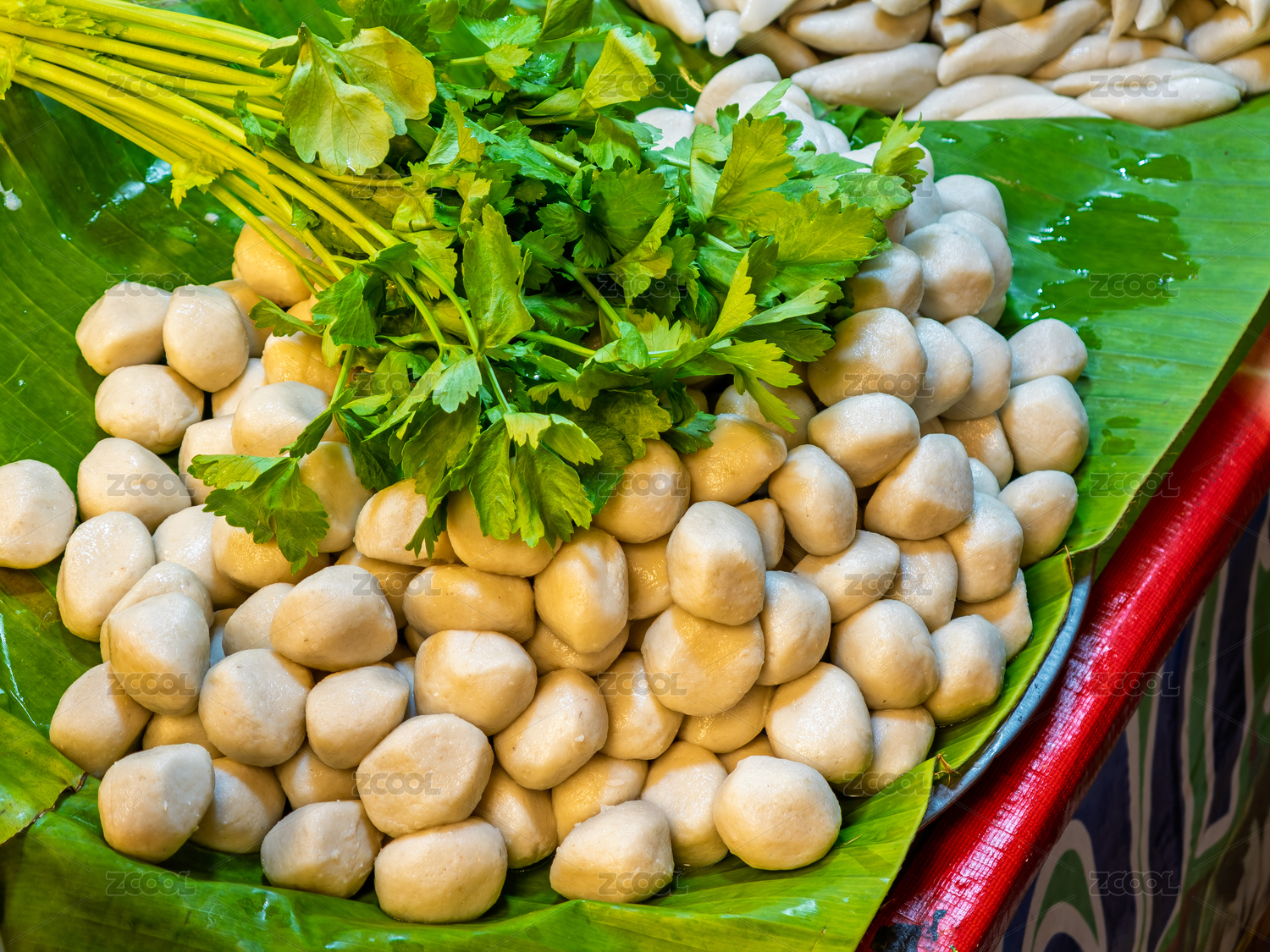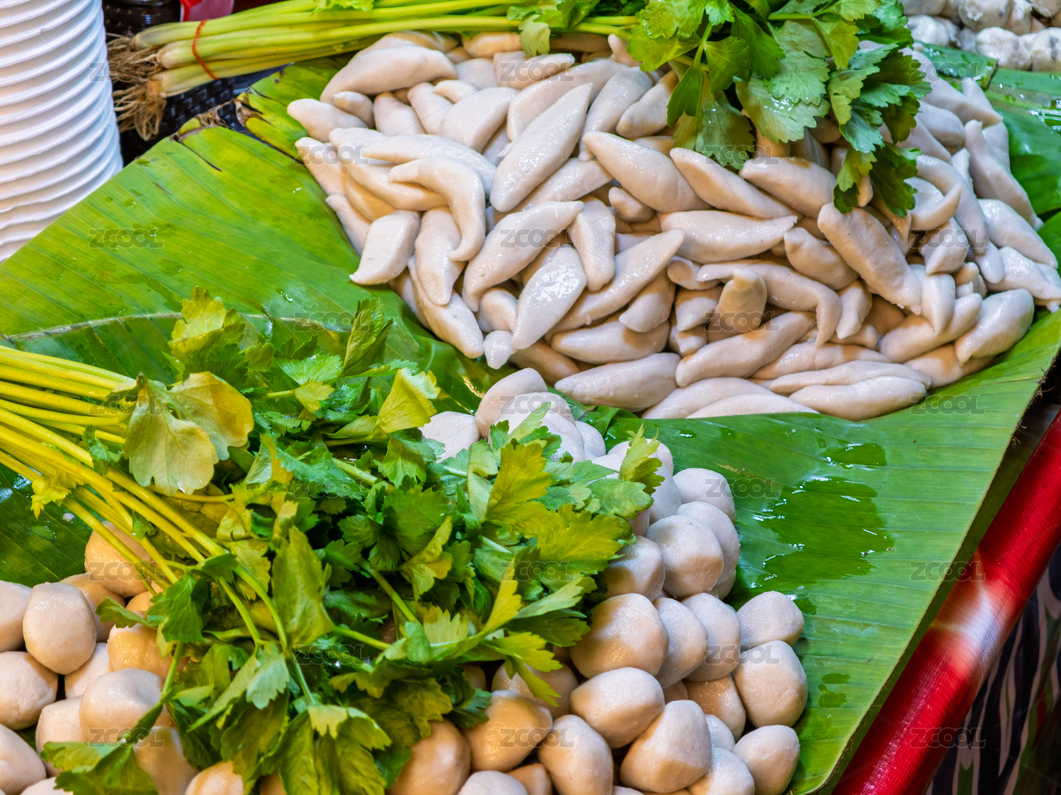 摆放在绿色香蕉叶上的新鲜泰式鱼丸和鱼饼