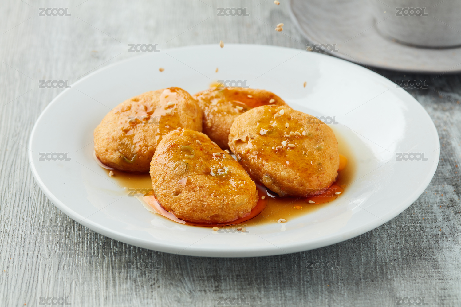 木板背景上一盘鱼饼