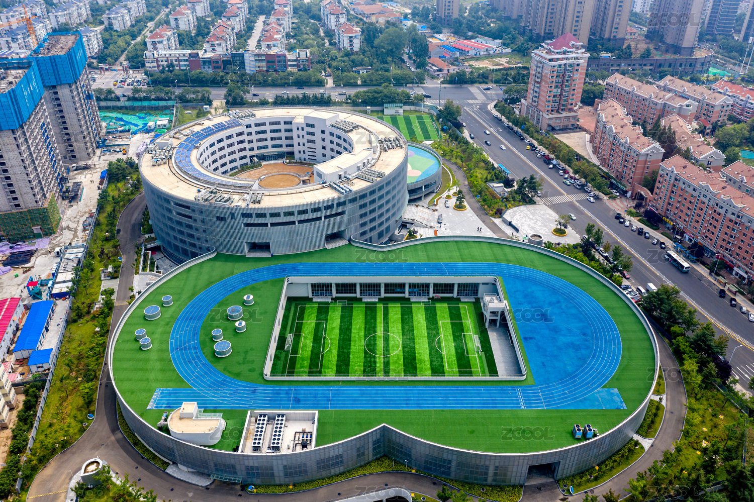 中国山东青岛下沉式体育场航拍效果图
