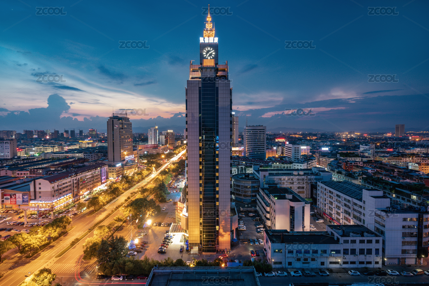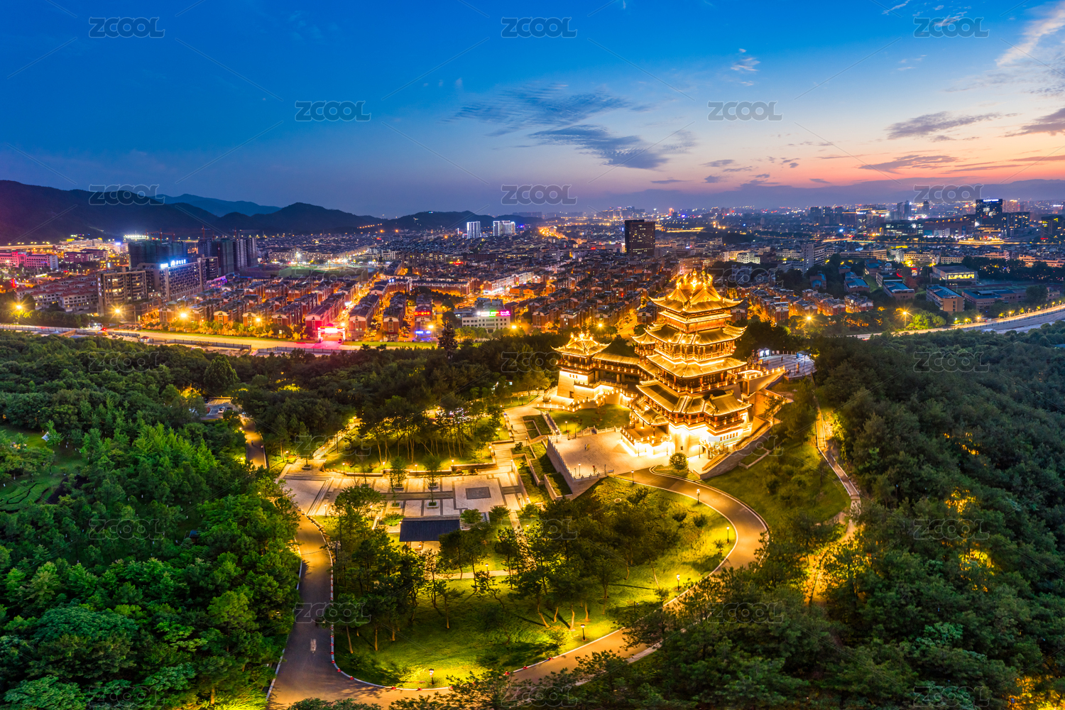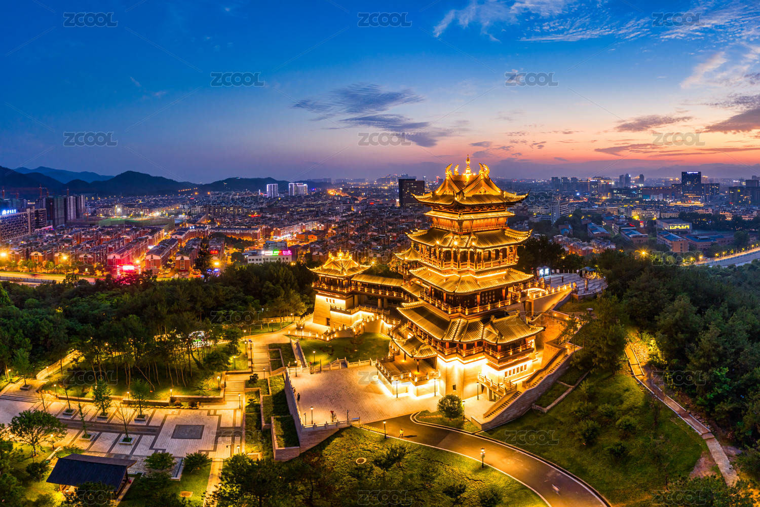 浙江义乌鸡鸣山公园鸡鸣阁夜景航拍