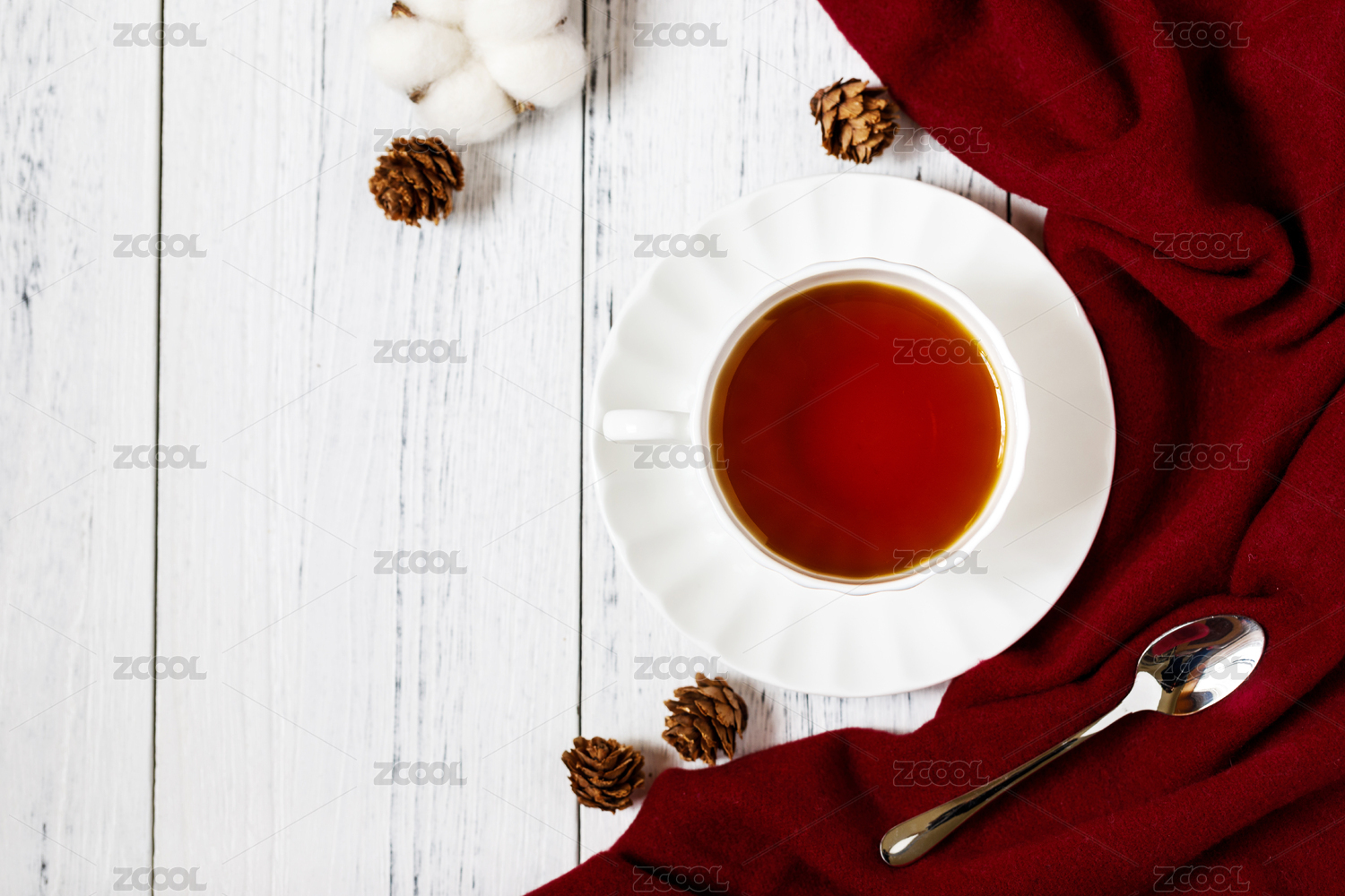 放在白木板上松果和白瓷杯里的中国云南凤庆红茶斜视图