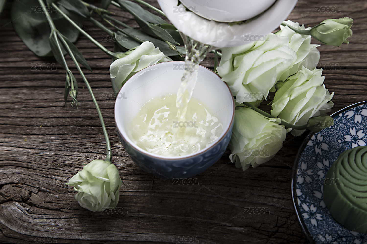 在老木风化的茶台上,德化白瓷里面的太平猴魁茶汤正在倒入外蓝内白的景德镇瓷杯中,旁边还有几支绿色桔梗鲜花映衬