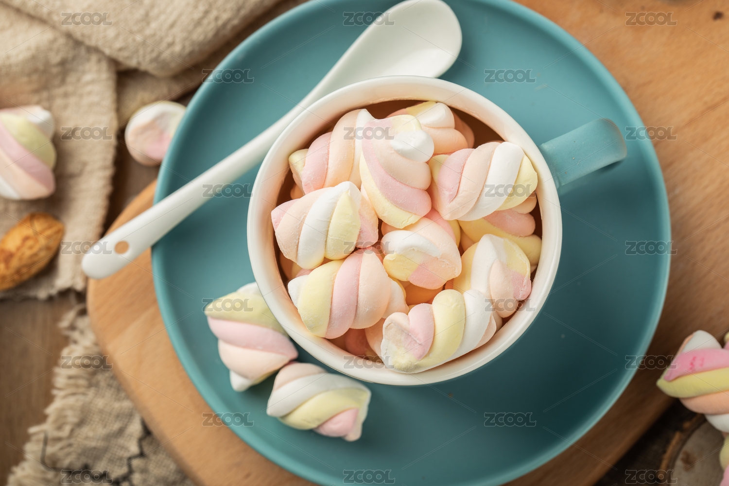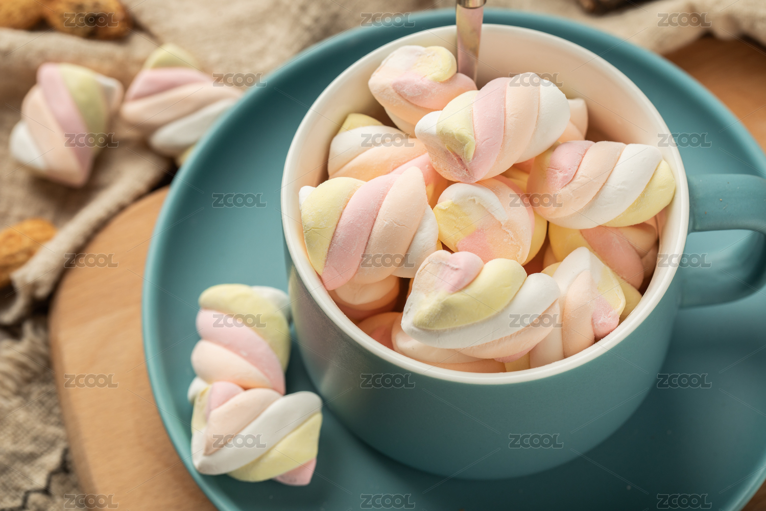 木质背景上蓝色的陶瓷杯与彩色棉花糖
