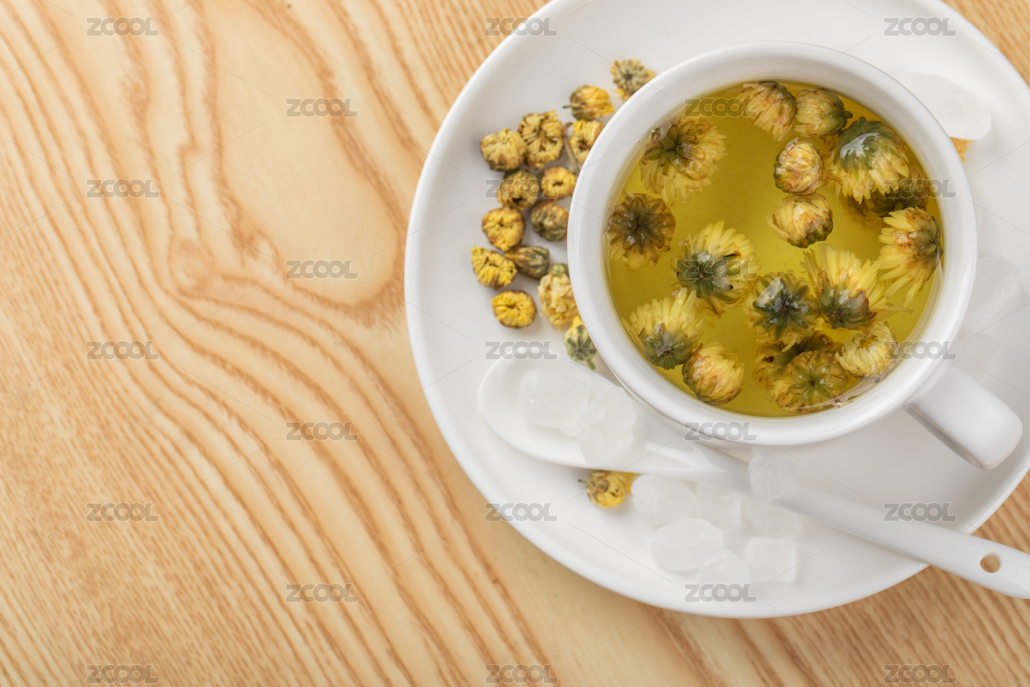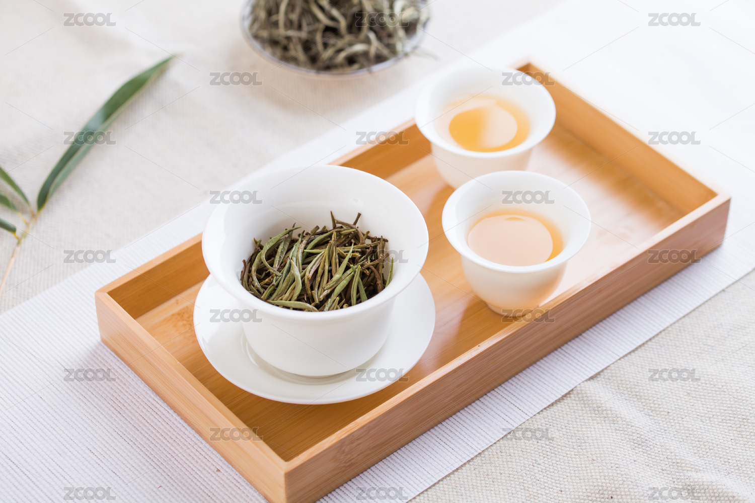 中式茶席上木托盘里白瓷杯里的白茶茶汤