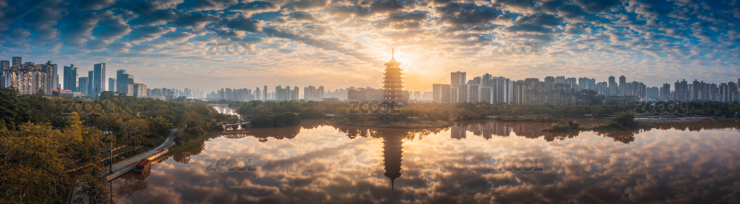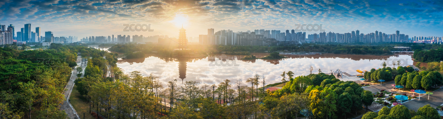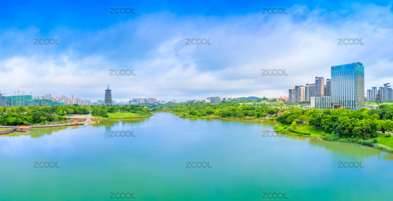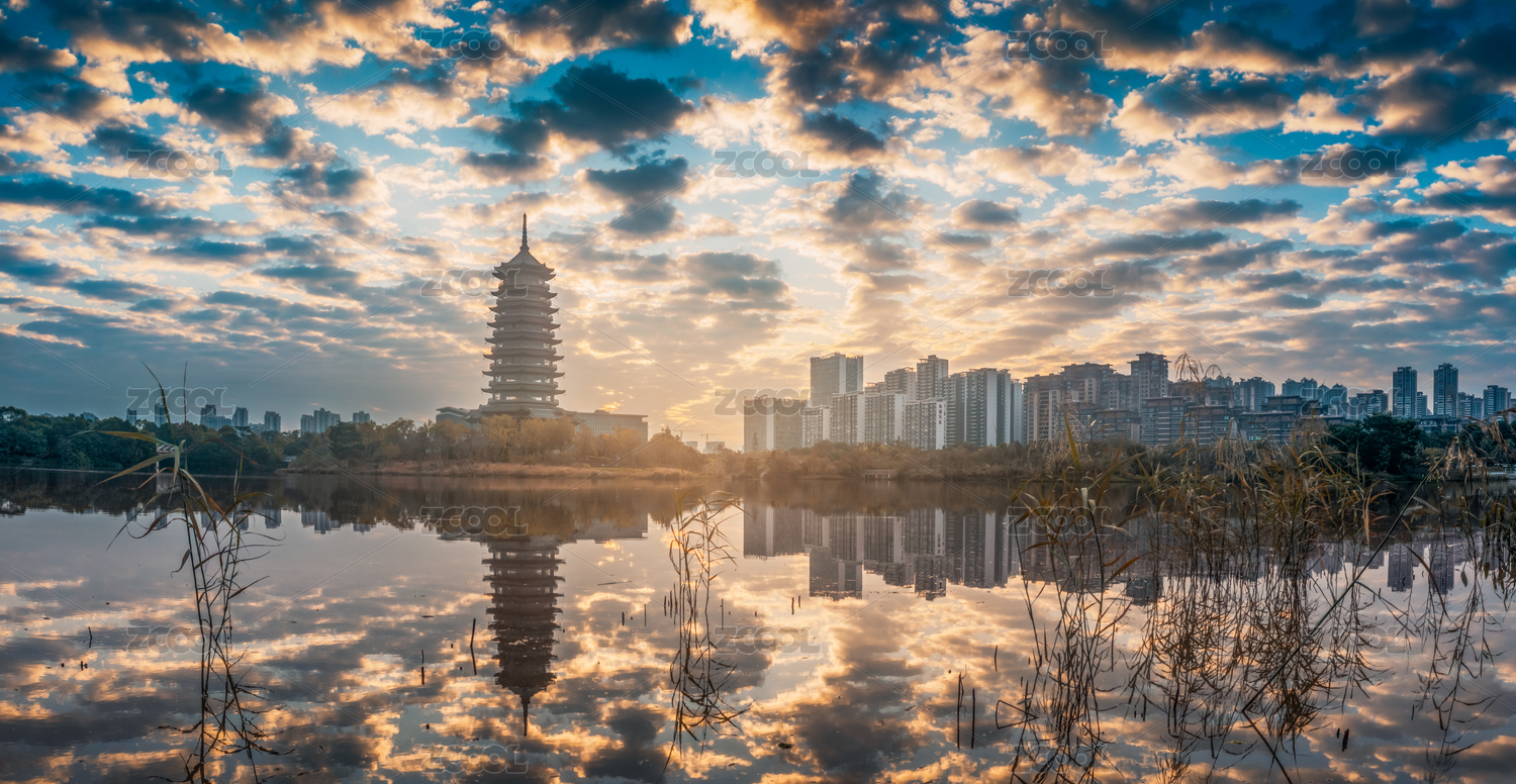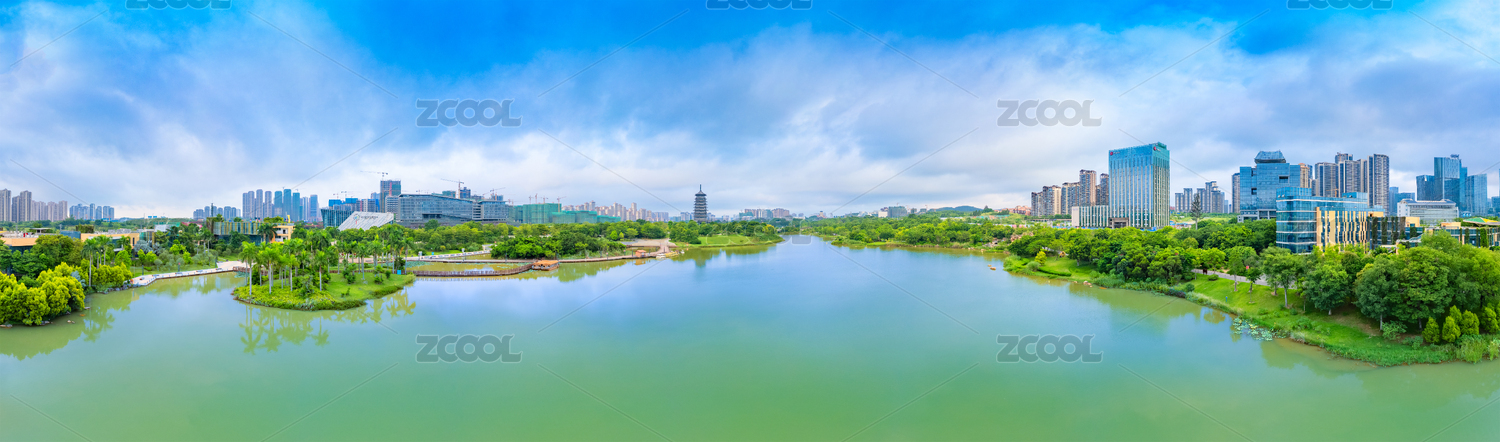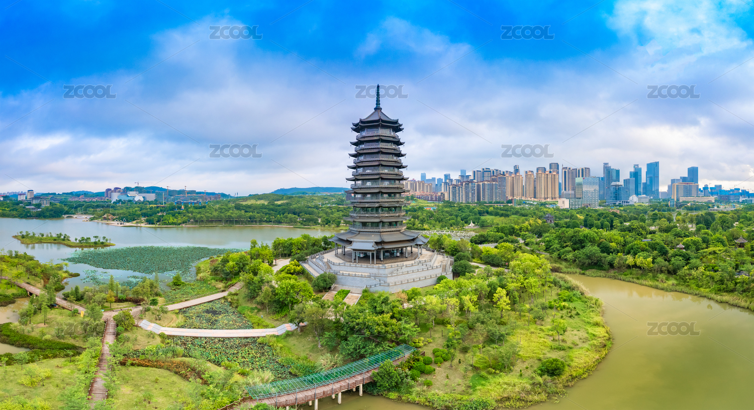 南宁五象湖公园湖上休闲广场与五象塔景观
