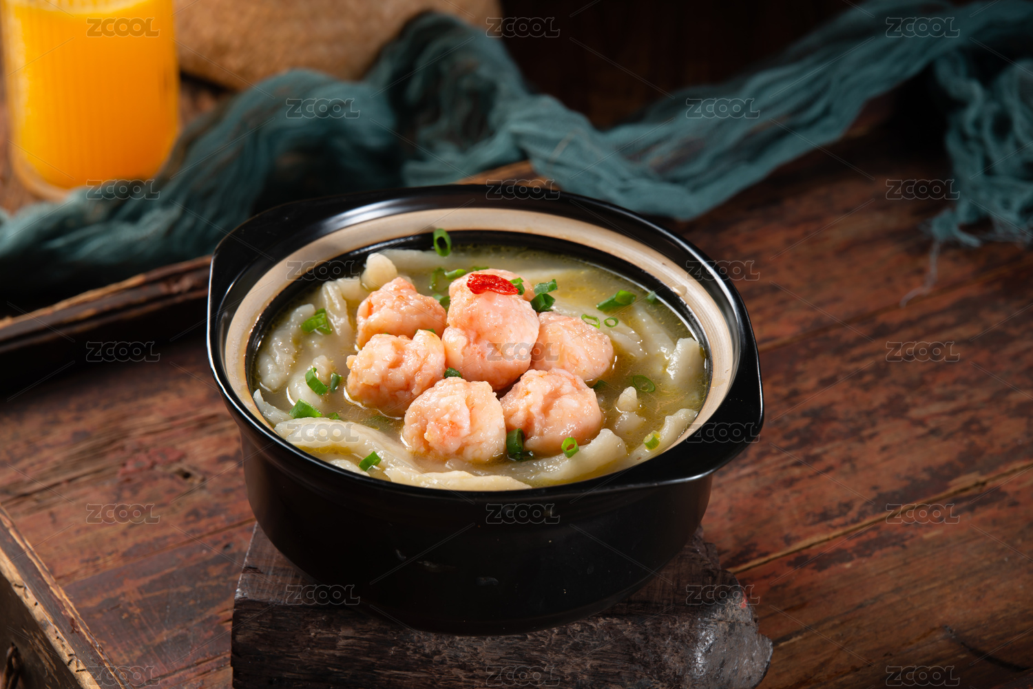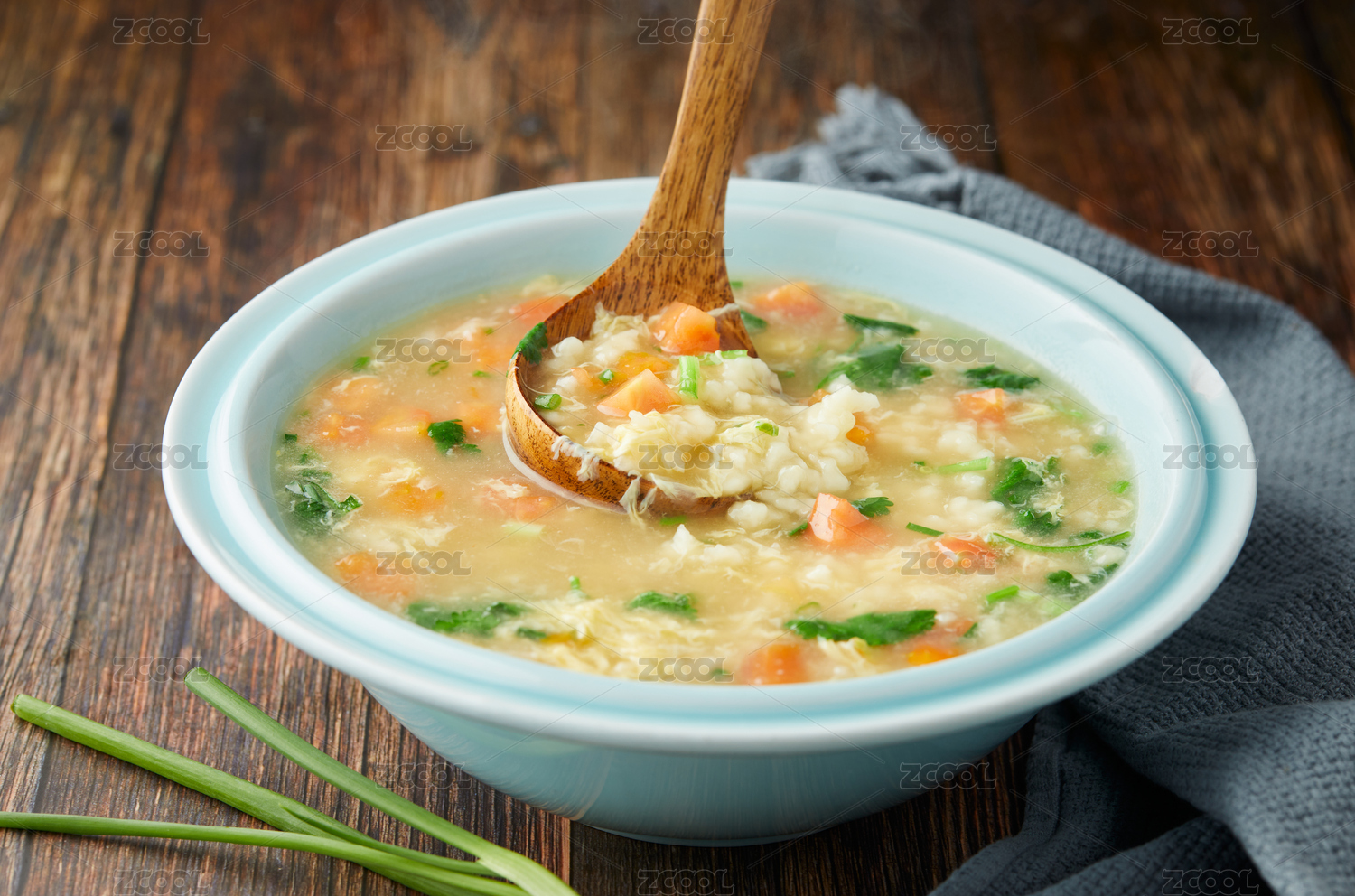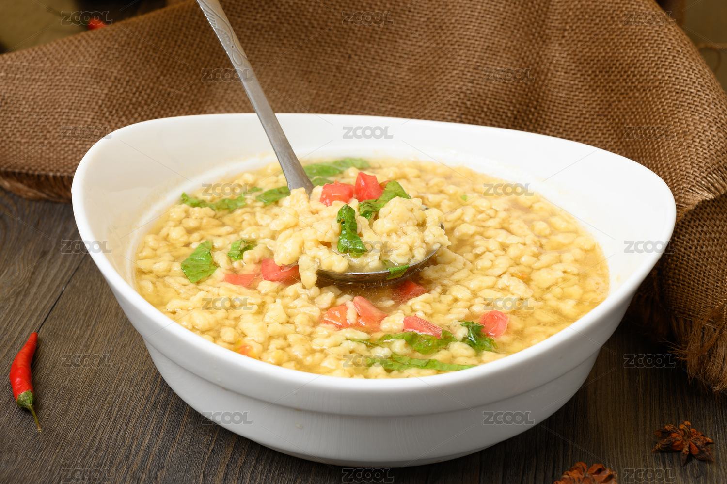 一碗疙瘩汤放在木制底板上