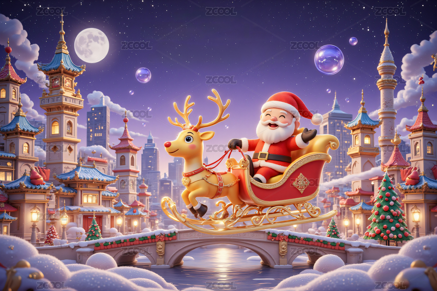 圣诞老人驾着驯鹿拉的雪橇车飞行