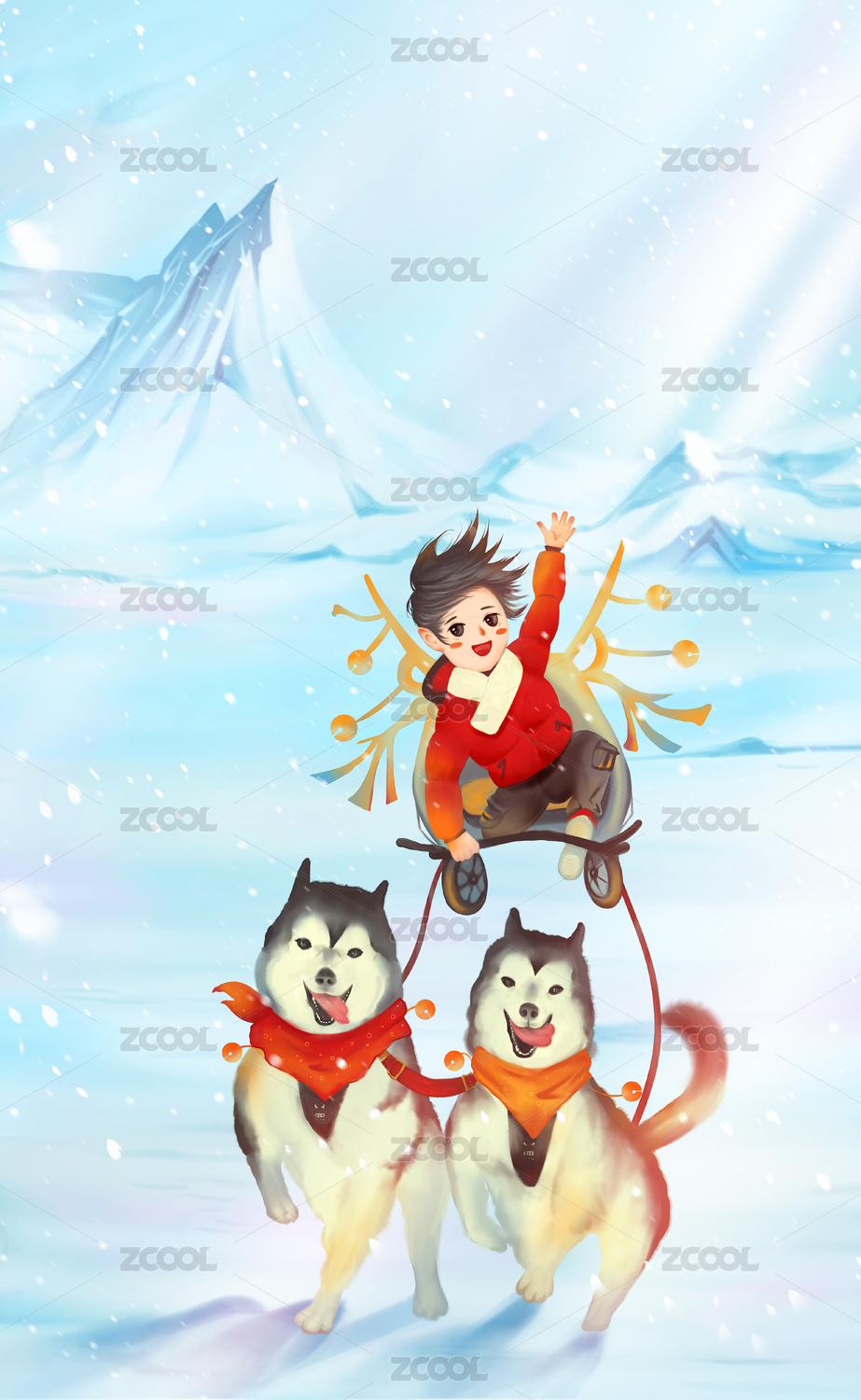 冬季坐在雪橇车上欢呼的男孩 男孩坐在两只雪橇犬拉的车上回家清新蓝色插画竖版