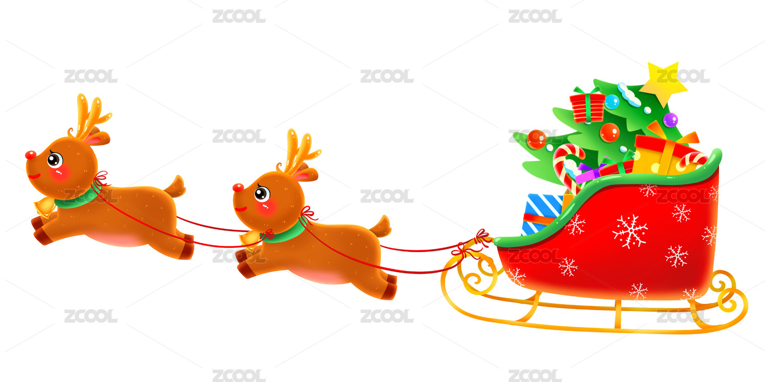 3D圣诞节拉着装着礼物的雪橇车的驯鹿