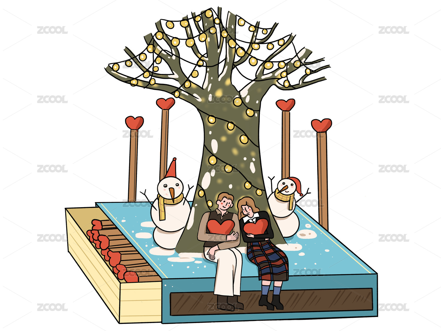 冬日浪漫火柴盒情侣雪人街灯
