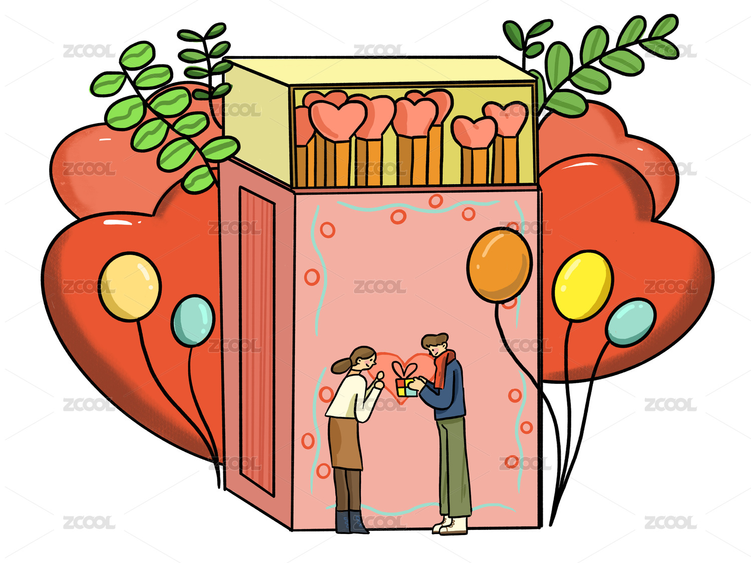 粉色扁平风火柴盒情侣花朵