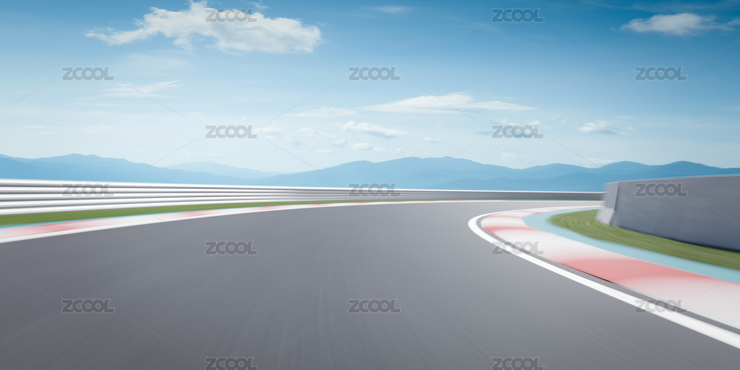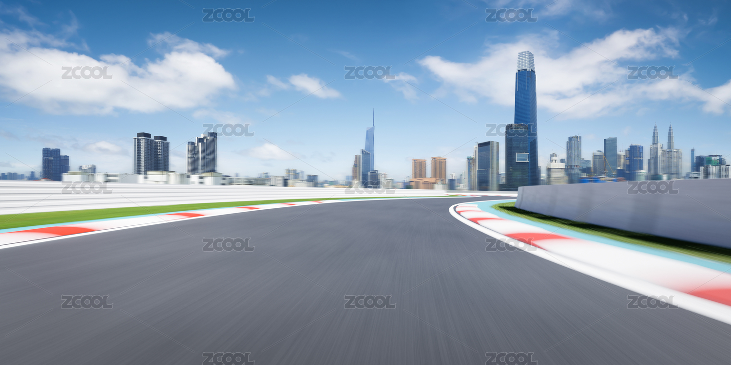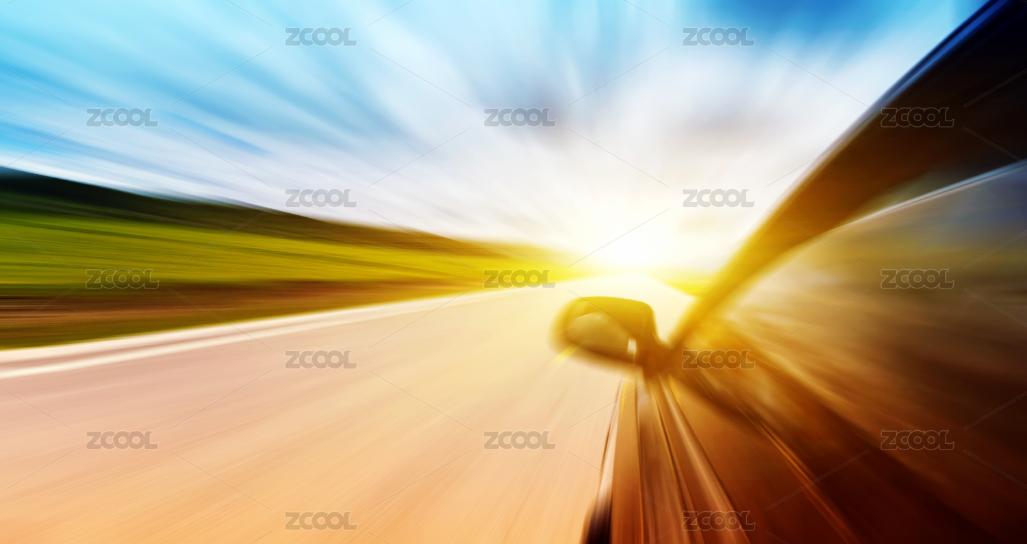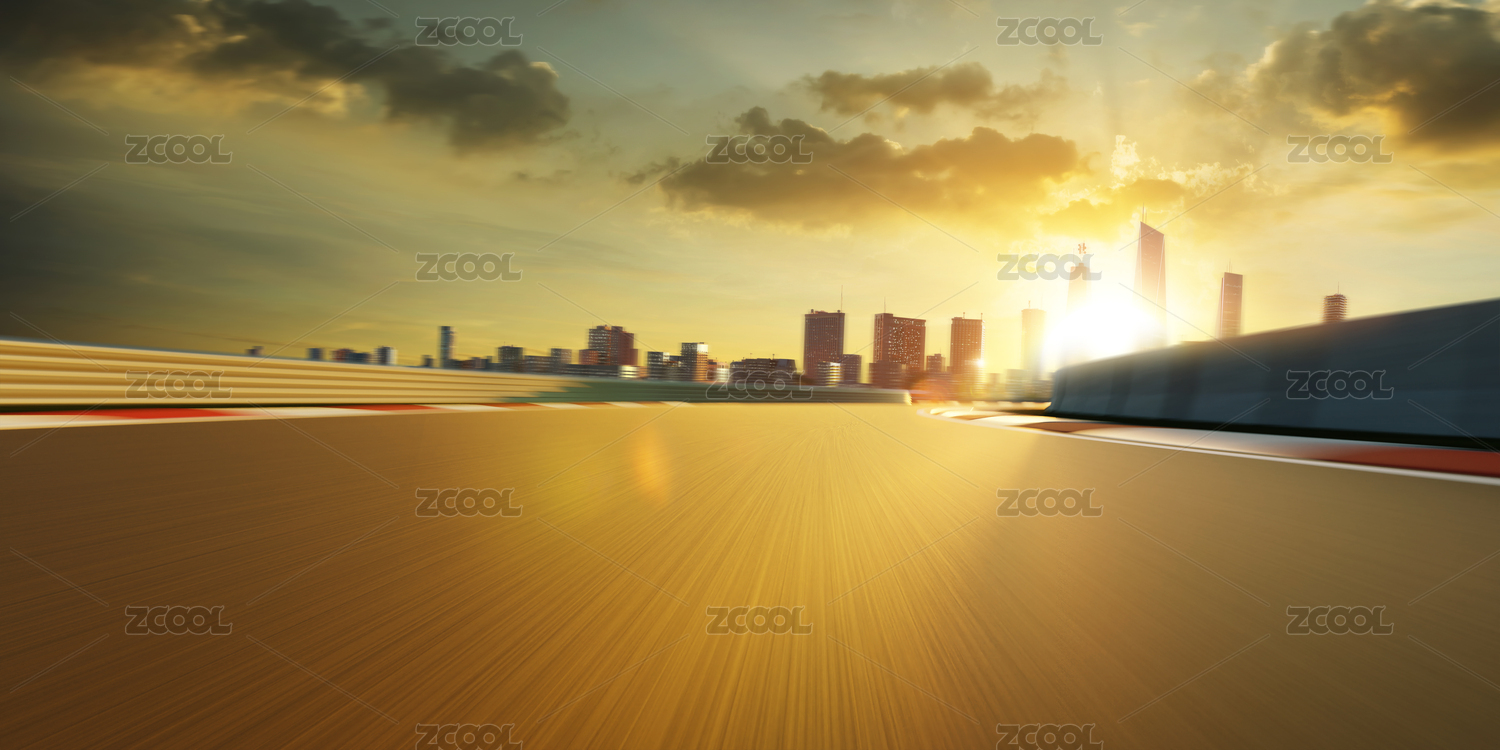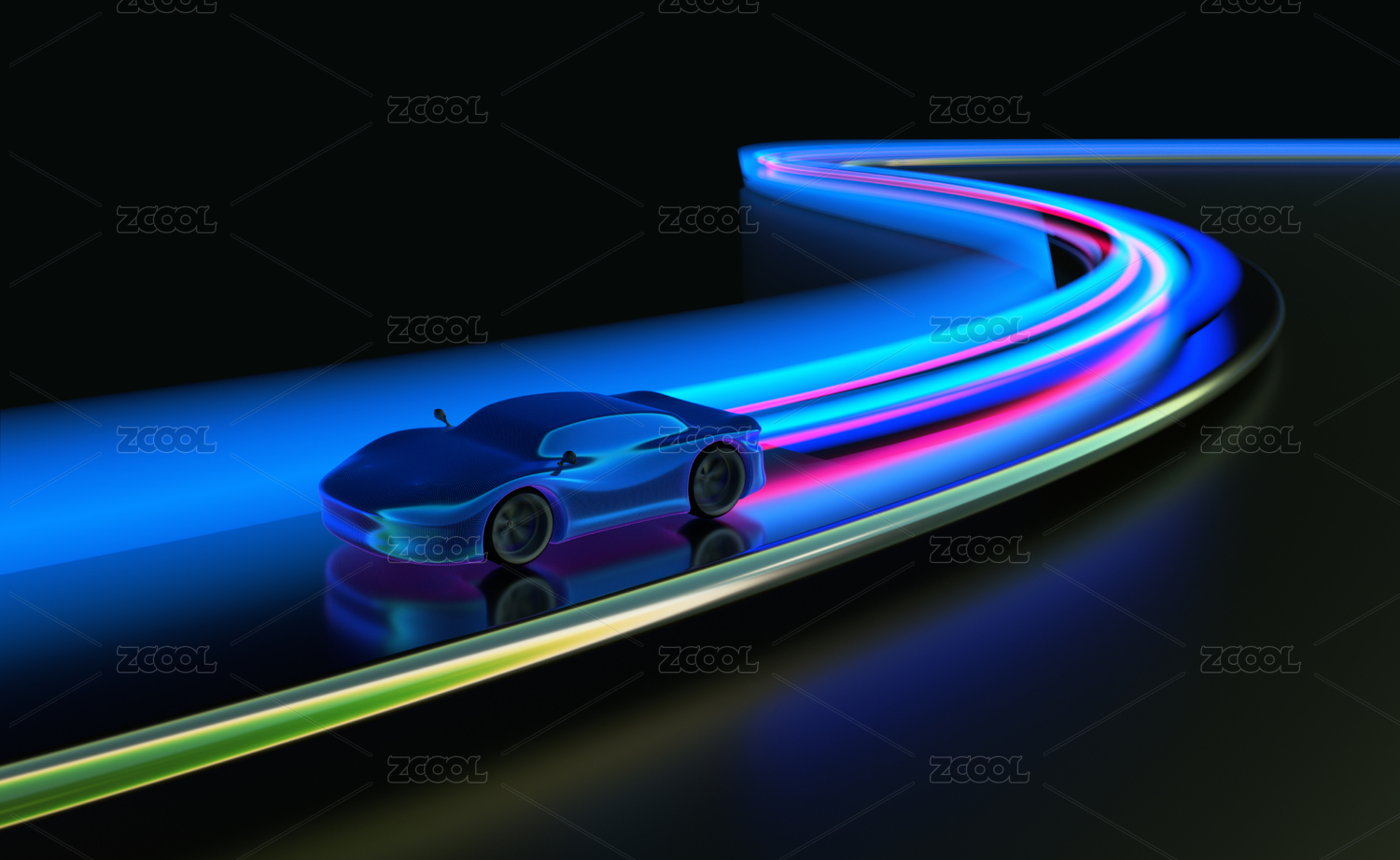 红色包车奔驰在抽象转动扭曲的高速公路与城市